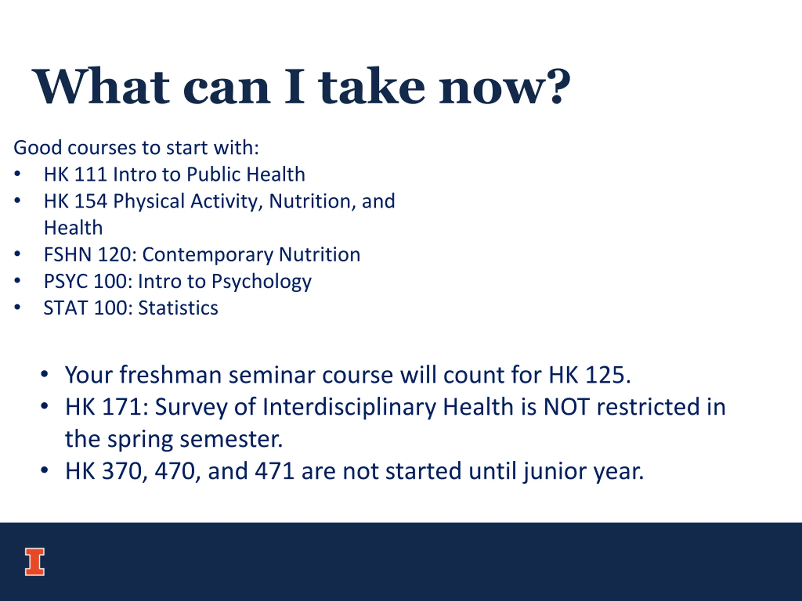 What can I take now? Good courses to start with: HK 111 Intro to Public Health HK 154 Physical Activity, Nutrition, and Health FSHN 120: Contemporary Nutrition PSYC 100: Intro to Psychology STAT 100: Statistics Includes full-semester internship in health agency! Your freshman seminar course will count for HK 125. HK 171: Survey of Interdisciplinary Health is NOT restricted in the spring semester. HK 370, 470, and 471 are not started until junior year.