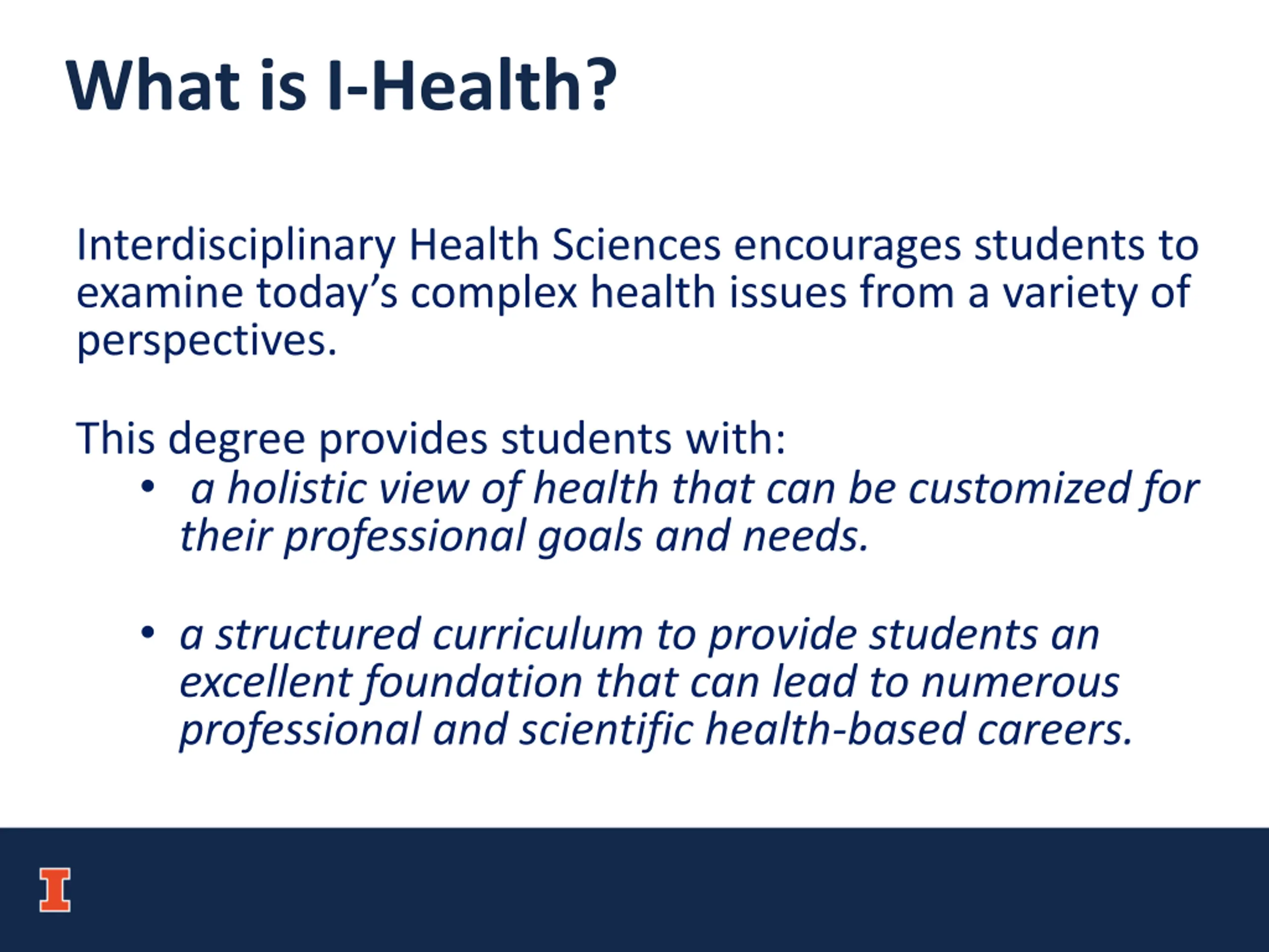 What is I-Health? Interdisciplinary Health Sciences encourages students to examine today s complex health issues from a variety of perspectives. This degree provides students with: a holistic view of health that can be customized for their professional goals and needs. a structured curriculum to provide students an excellent foundation that can lead to numerous professional and scientific health-based careers.