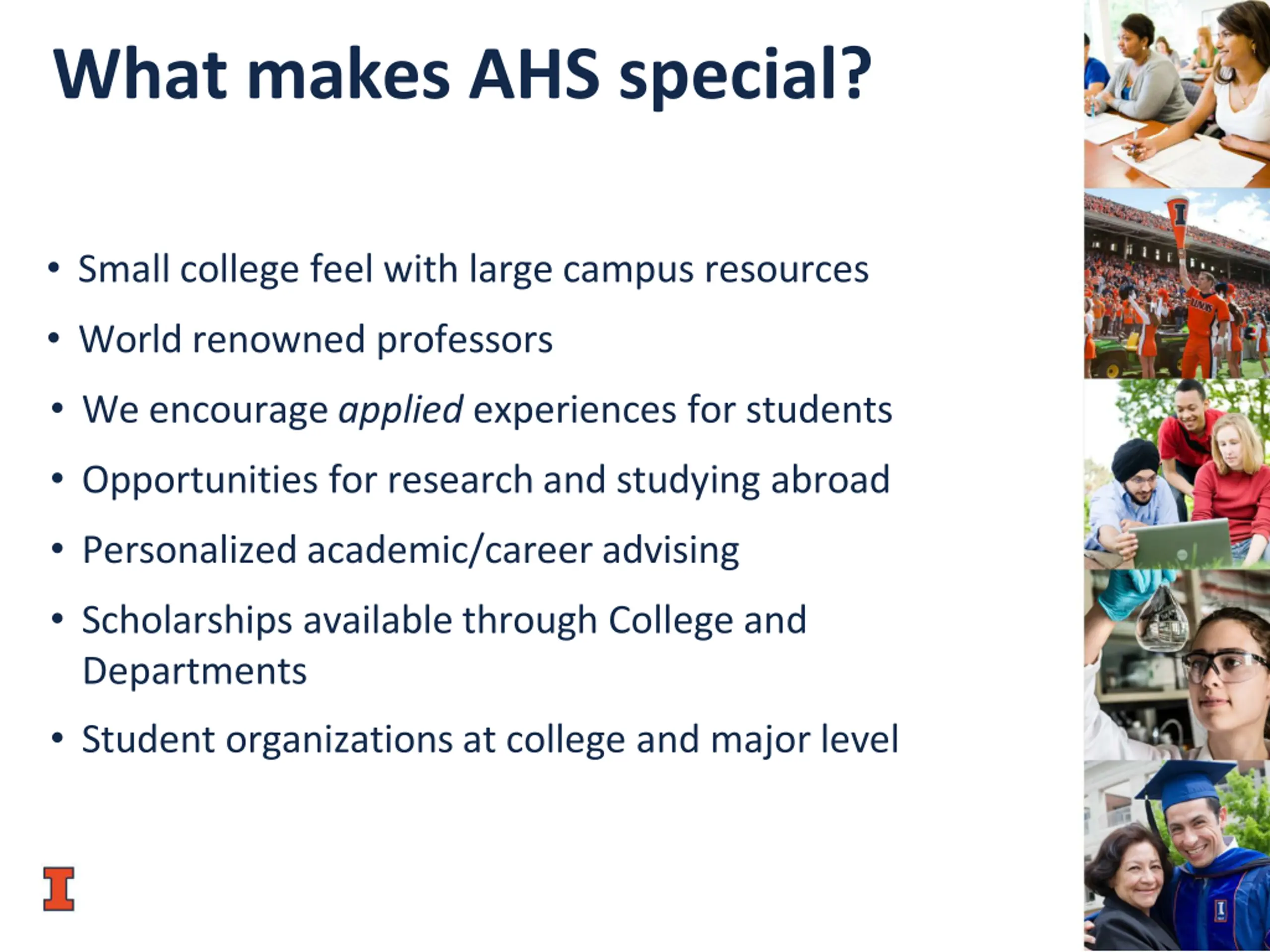 What makes AHS special? Small college feel with large campus resources World renowned professors We encourage applied experiences for students Opportunities for research and studying abroad Personalized academic/career advising Scholarships available through College and Departments Student organizationsat college and major level