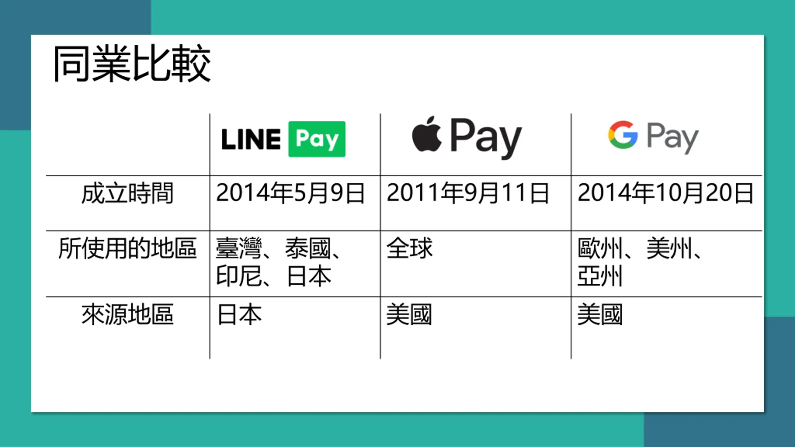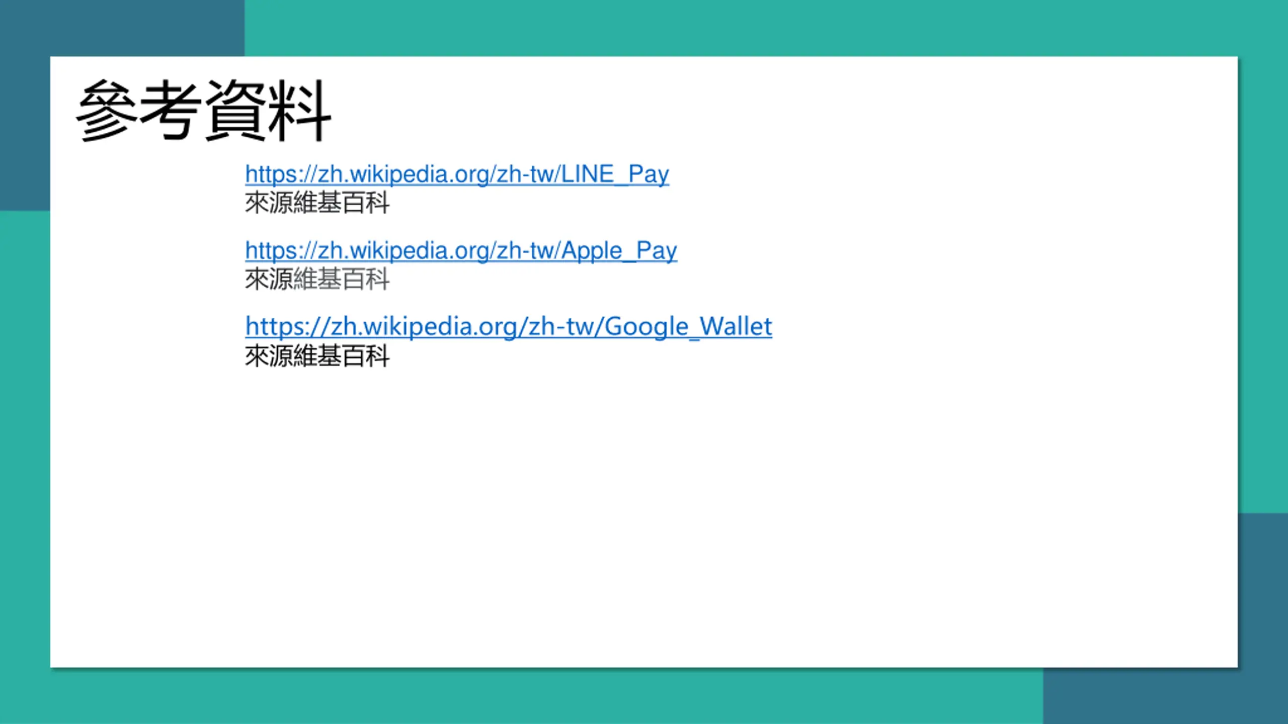 https://zh.wikipedia.org/zh-tw/LINE_Pay https://zh.wikipedia.org/zh-tw/Apple_Pay https://zh.wikipedia.org/zh-tw/Google_Wallet