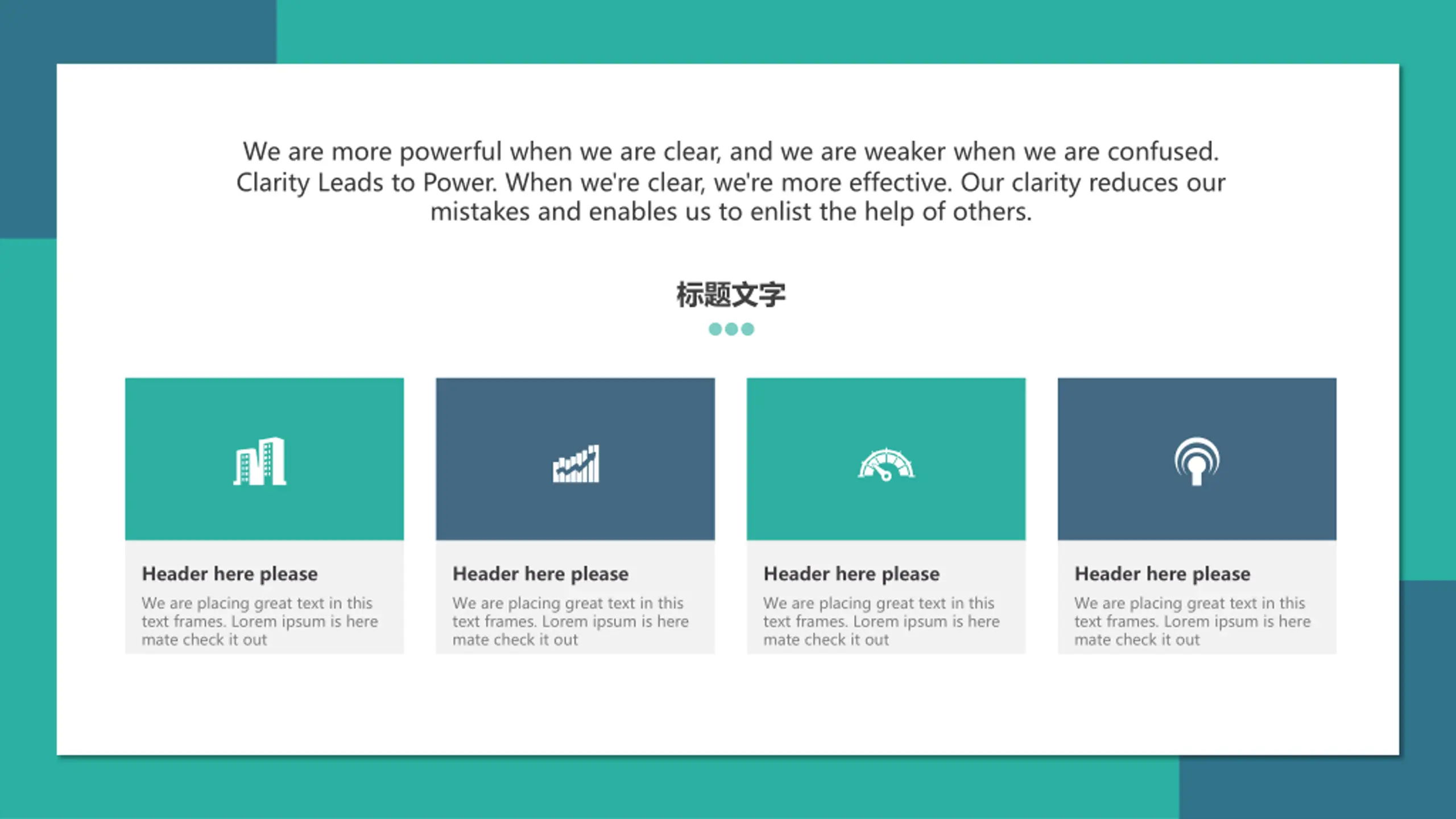 We are more powerful when we are clear, and we are weaker when we are confused. Clarity Leads to Power. When we're clear, we're more effective. Our clarity reduces our mistakes and enables us to enlist the help of others. Header here please Header here please Header here please Header here please We are placing great text in this text frames. Lorem ipsum is here mate check it out We are placing great text in this text frames. Lorem ipsum is here mate check it out We are placing great text in this text frames. Lorem ipsum is here mate check it out We are placing great text in this text frames. Lorem ipsum is here mate check it out