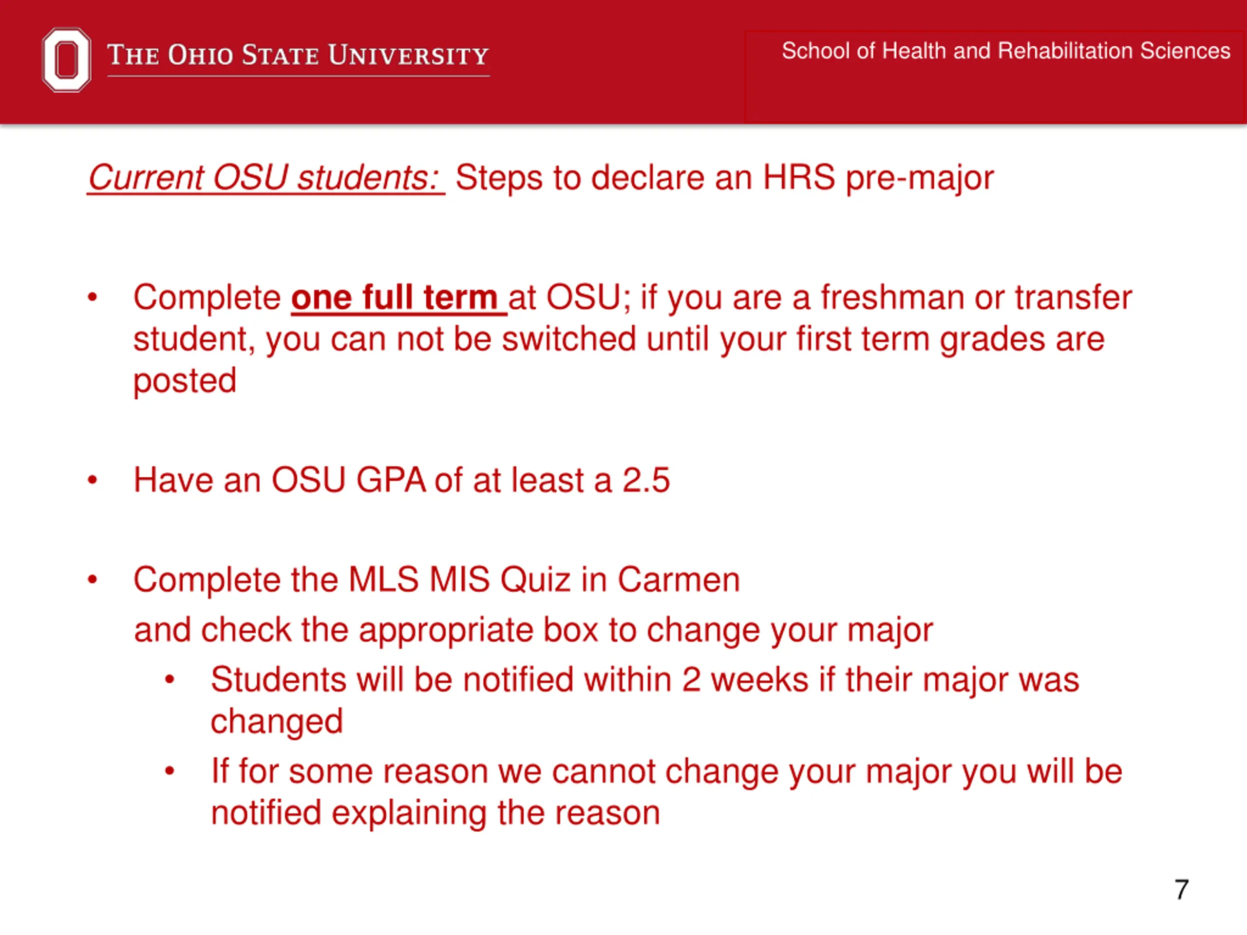 School of Health and Rehabilitation Sciences Current OSU students: Steps to declare an HRS pre-major Complete one full term at OSU; if you are a freshman or transfer student, you can not be switched until your first term grades are posted Have an OSU GPA of at least a 2.5 Complete the MLS MIS Quiz in Carmen and check the appropriate box to change your major Students will be notified within 2 weeks if their major was changed If for some reason we cannot change your major you will be notified explaining the reason 7