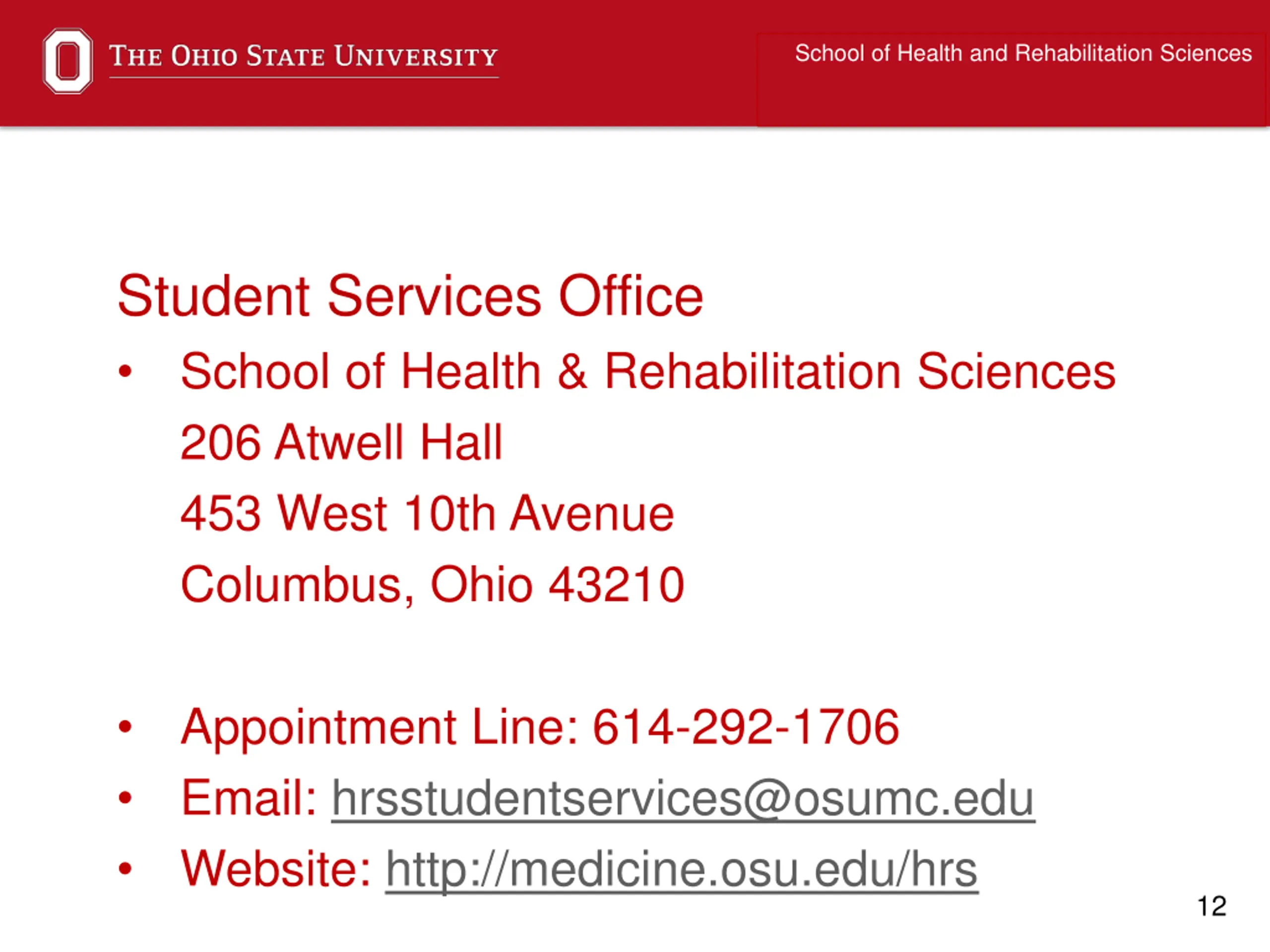 School of Health and Rehabilitation Sciences Student Services Office School of Health & Rehabilitation Sciences 206 Atwell Hall 453 West 10th Avenue Columbus, Ohio 43210 Appointment Line: 614-292-1706 Email: hrsstudentservices@osumc.edu Website: http://medicine.osu.edu/hrs 12