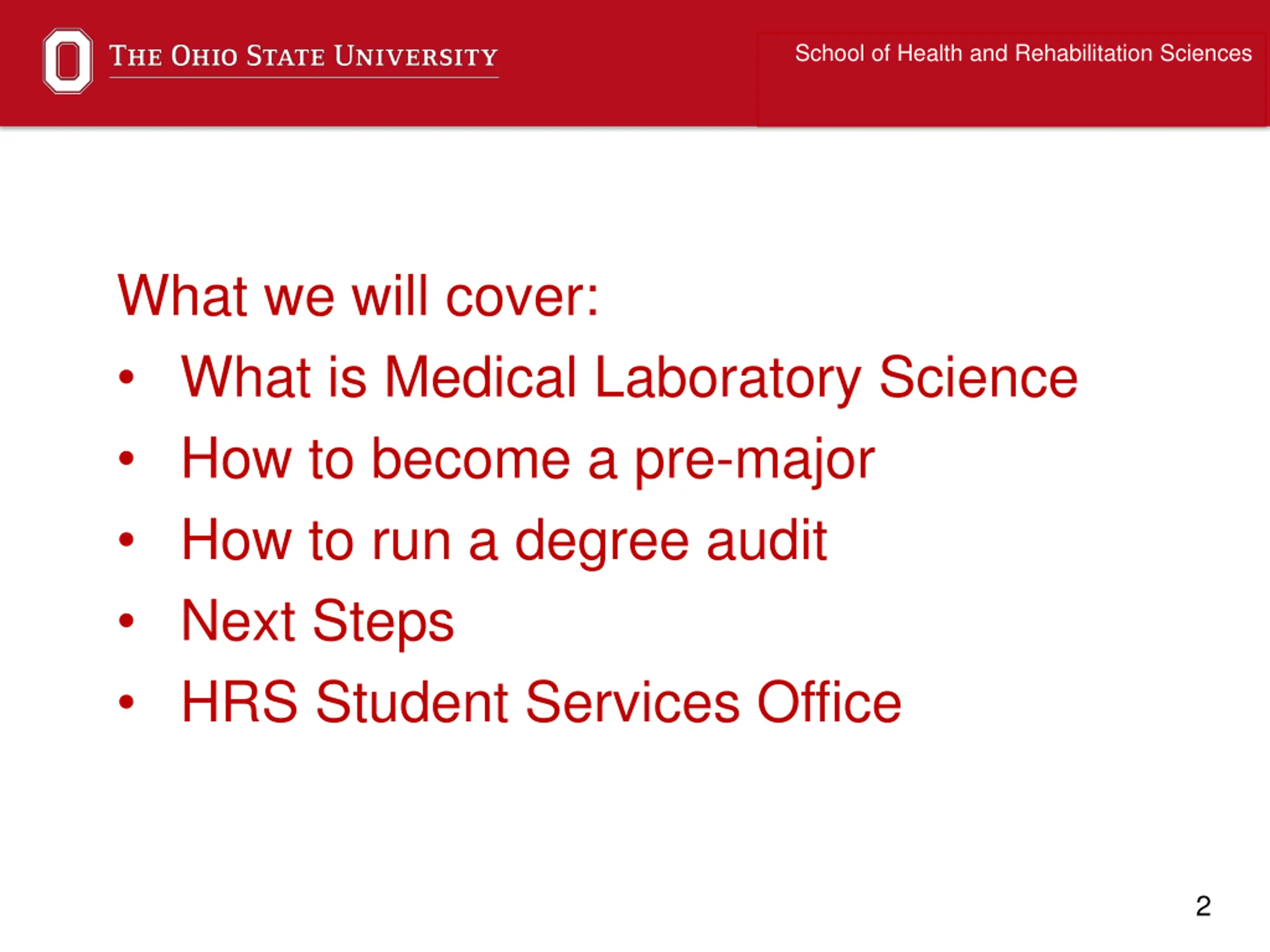 School of Health and Rehabilitation Sciences What we will cover: What is Medical Laboratory Science How to become a pre-major How to run a degree audit Next Steps HRS Student Services Office 2