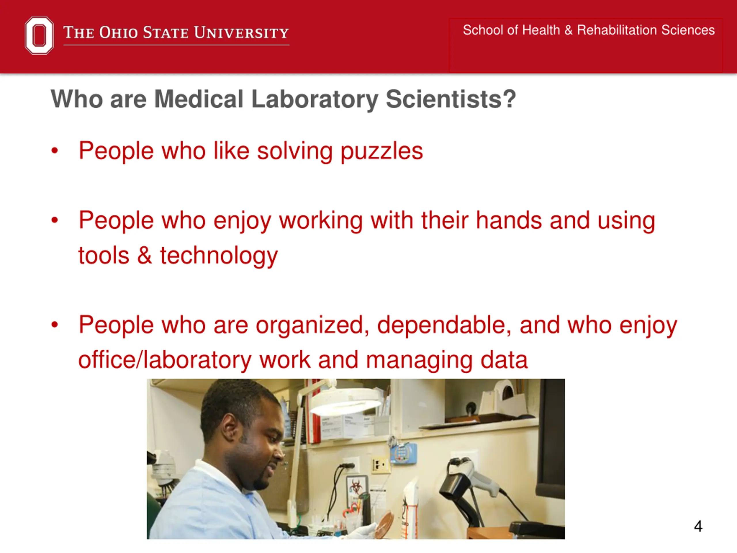 School of Health & Rehabilitation Sciences Who are Medical Laboratory Scientists? People who like solving puzzles People who enjoy working with their hands and using tools & technology People who are organized, dependable, and who enjoy office/laboratory work and managing data 4