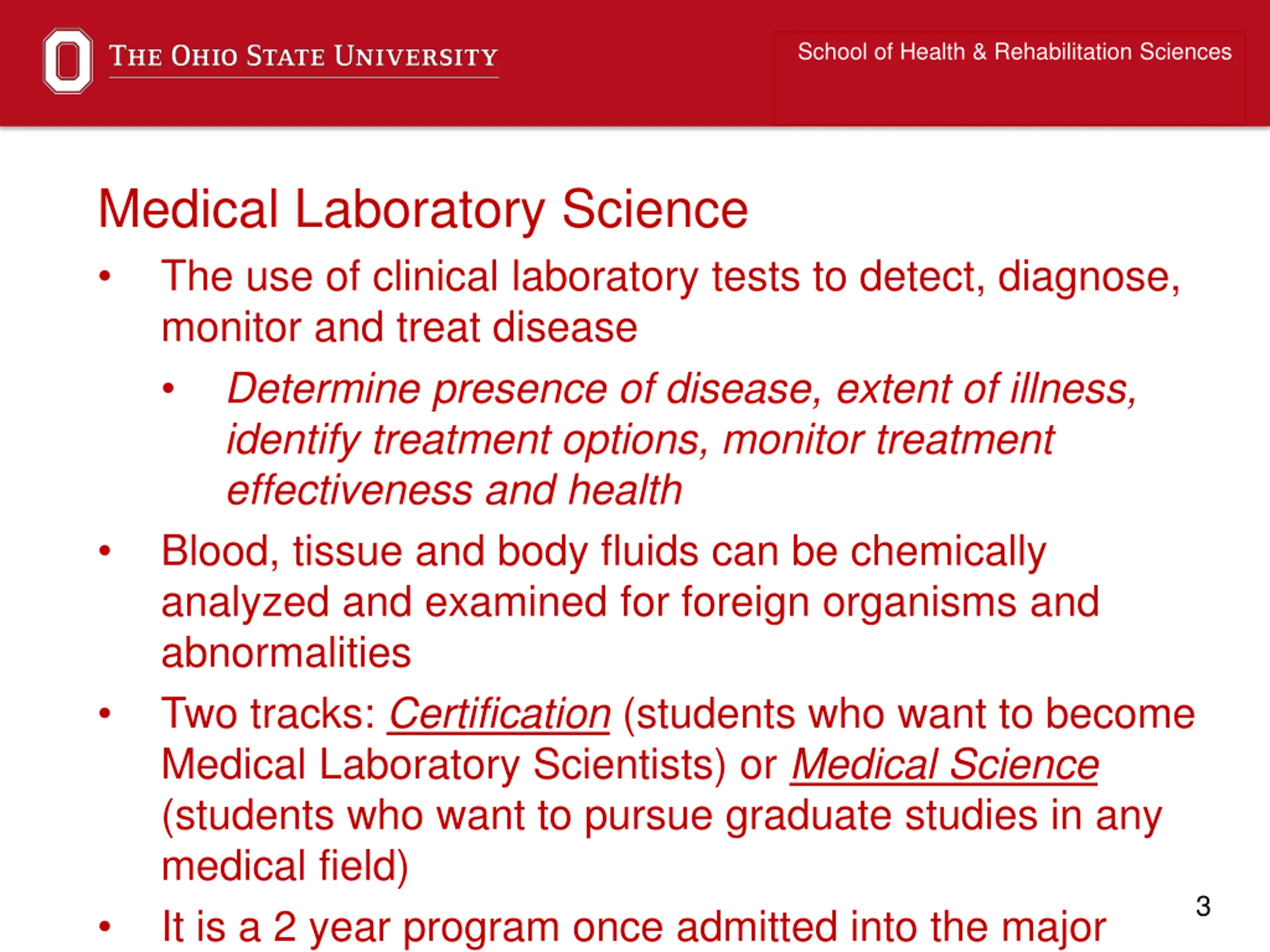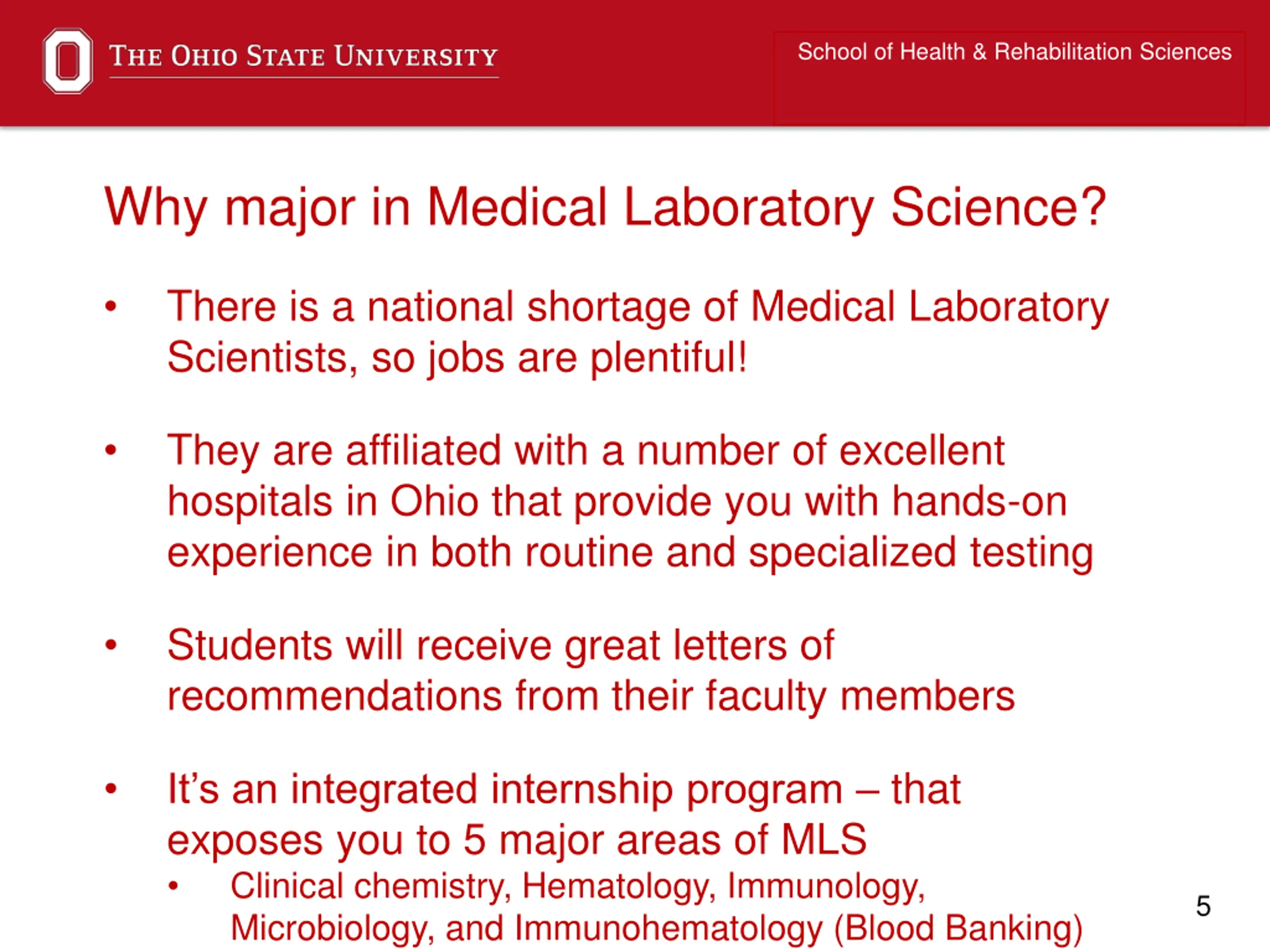 School of Health & Rehabilitation Sciences Why major in Medical Laboratory Science? There is a national shortage of Medical Laboratory Scientists, so jobs are plentiful! They are affiliated with a number of excellent hospitals in Ohio that provide you with hands-on experience in both routine and specialized testing Students will receive great letters of recommendations from their faculty members It s an integrated internship program that exposes you to 5 major areas of MLS Clinical chemistry, Hematology, Immunology, Microbiology, and Immunohematology (Blood Banking) 5