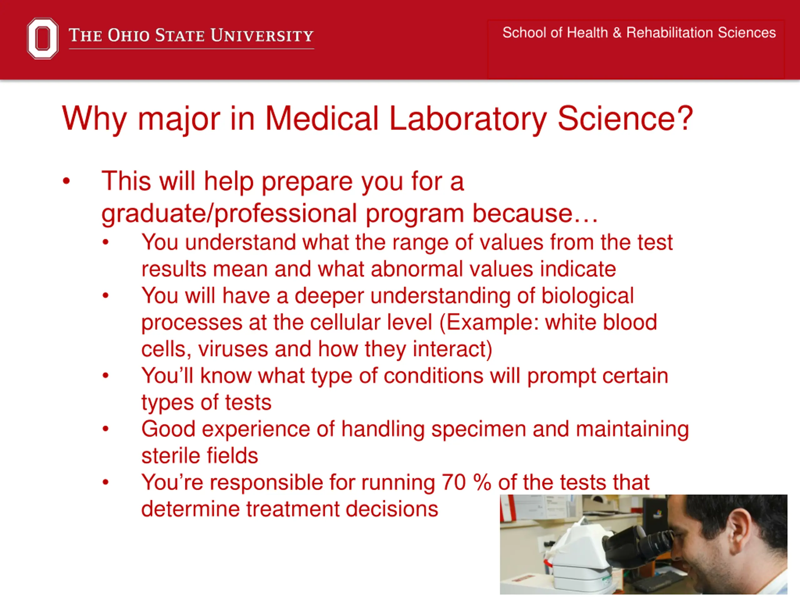School of Health & Rehabilitation Sciences Why major in Medical Laboratory Science? This will help prepare you for a graduate/professional program because You understand what the range of values from the test results mean and what abnormal values indicate You will have a deeper understanding of biological processes at the cellular level (Example: white blood cells, viruses and how they interact) You ll know what type of conditions will prompt certain types of tests Good experience of handling specimen and maintaining sterile fields You re responsible for running 70 % of the tests that determine treatment decisions 6