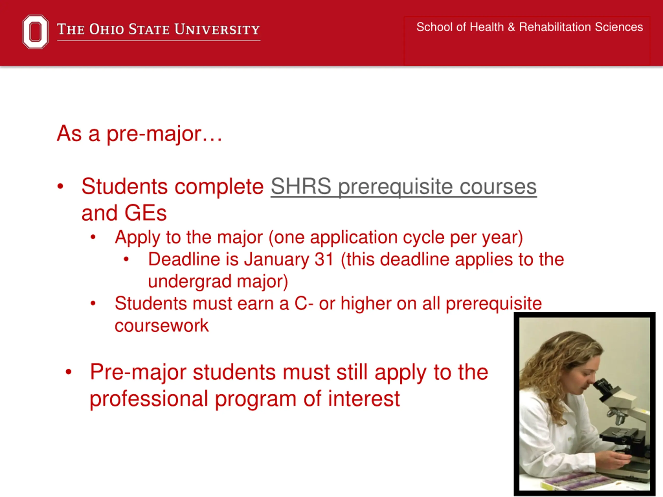 School of Health & Rehabilitation Sciences As a pre-major Students complete SHRS prerequisite courses and GEs Apply to the major (one application cycle per year) Deadline is January 31 (this deadline applies to the undergrad major) Students must earn a C- or higher on all prerequisite coursework Pre-major students must still apply to the professional program of interest 8