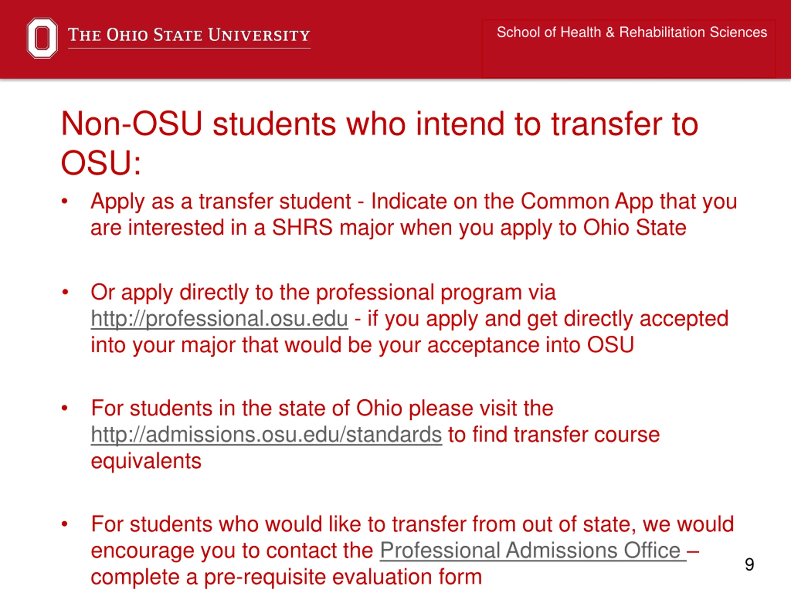 School of Health & Rehabilitation Sciences Non-OSU students who intend to transfer to OSU: Apply as a transfer student - Indicate on the Common App that you are interested in a SHRS major when you apply to Ohio State Or apply directly to the professional program via http://professional.osu.edu - if you apply and get directly accepted into your major that would be your acceptance into OSU For students in the state of Ohio please visit the http://admissions.osu.edu/standards to find transfer course equivalents For students who would like to transfer from out of state, we would encourage you to contact the Professional Admissions Office complete a pre-requisite evaluation form 9