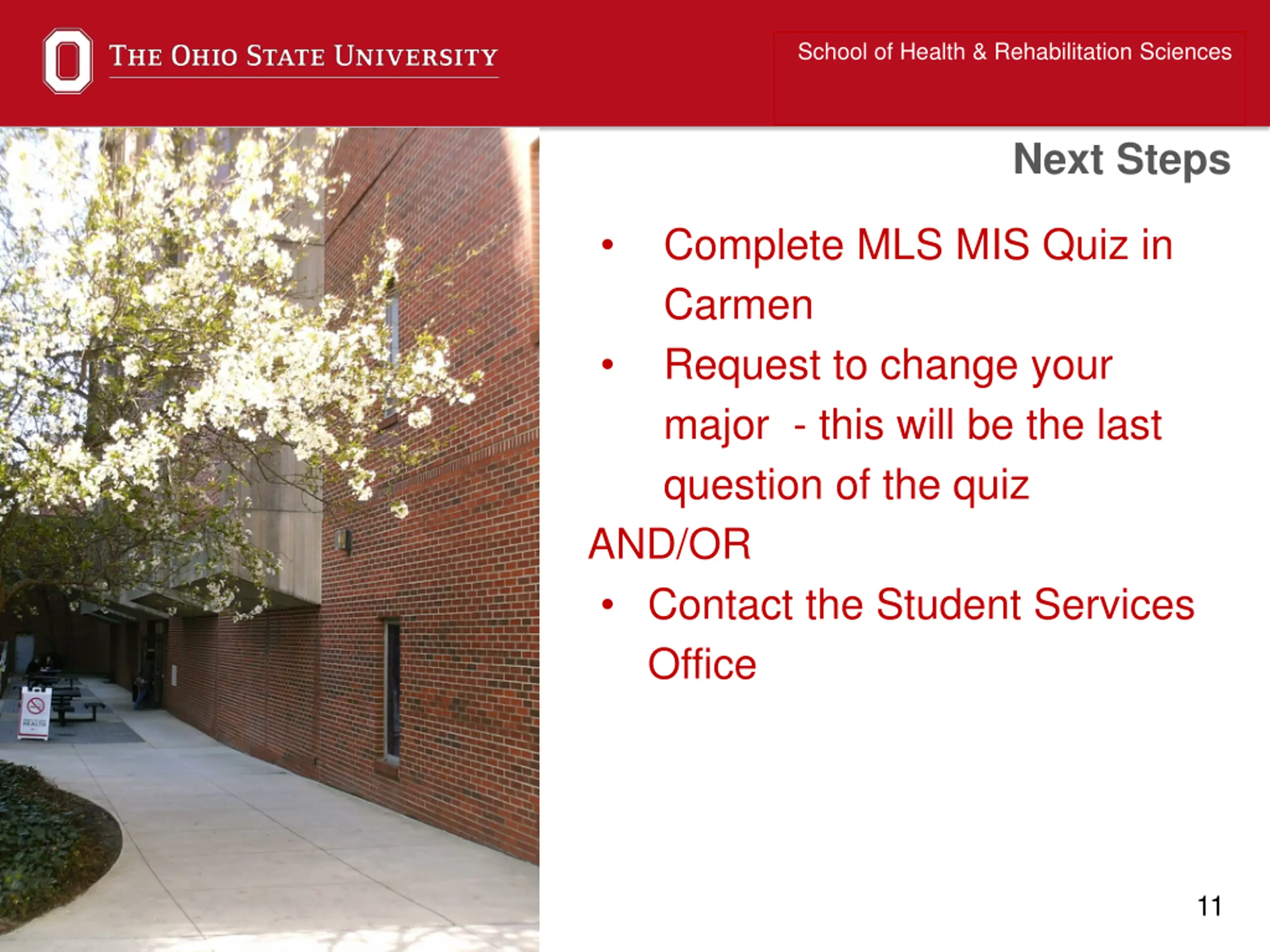 School of Health & Rehabilitation Sciences Next Steps Complete MLS MIS Quiz in Carmen Request to change your major - this will be the last question of the quiz AND/OR Contact the Student Services Office 11