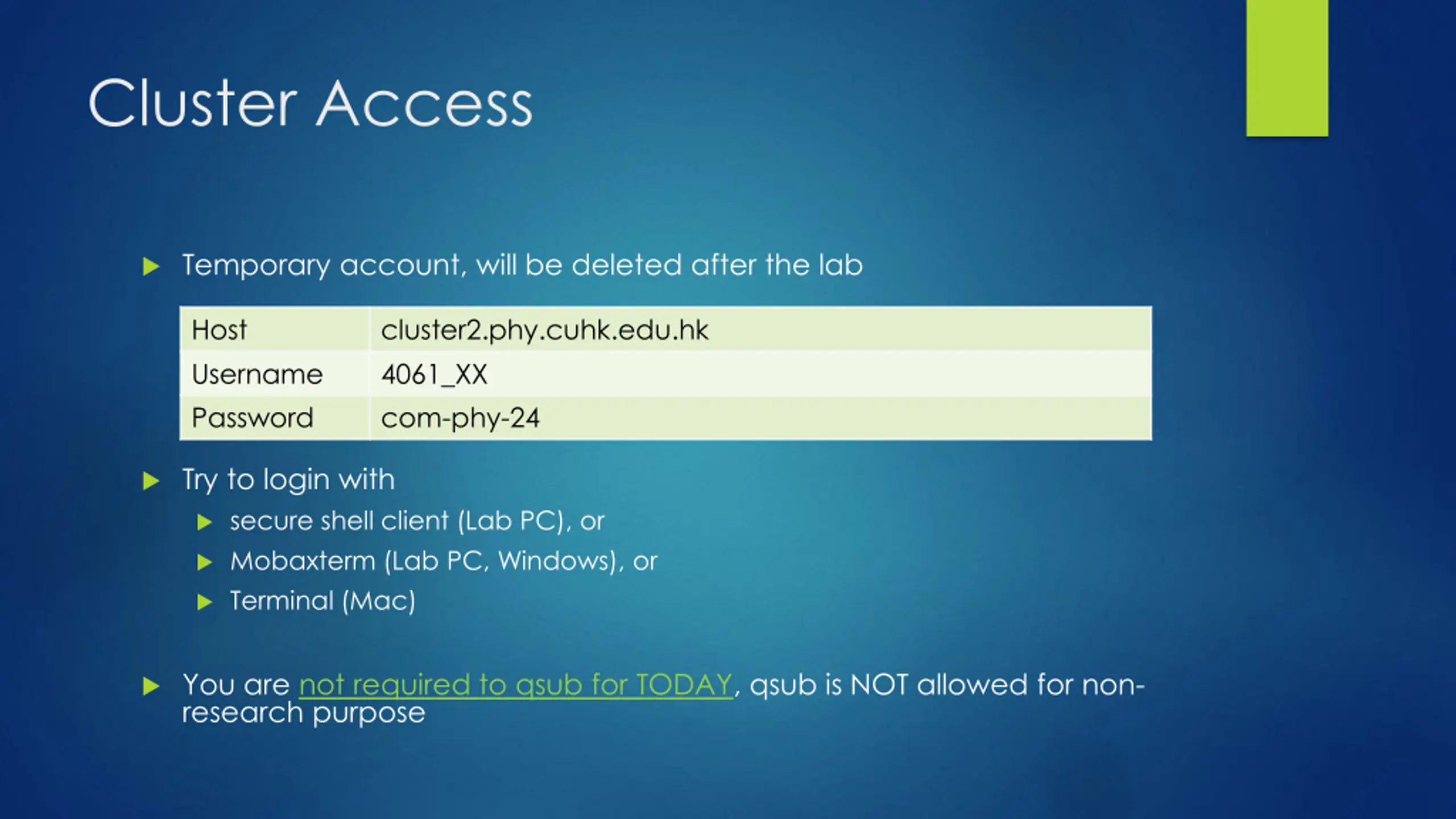 Cluster Access Temporary account, will be deleted after the lab Host Username Password cluster2.phy.cuhk.edu.hk 4061_XX com-phy-24 Try to login with secure shell client (Lab PC), or Mobaxterm (Lab PC, Windows), or Terminal (Mac) You are not required to qsub for TODAY, qsub is NOT allowed for non- research purpose