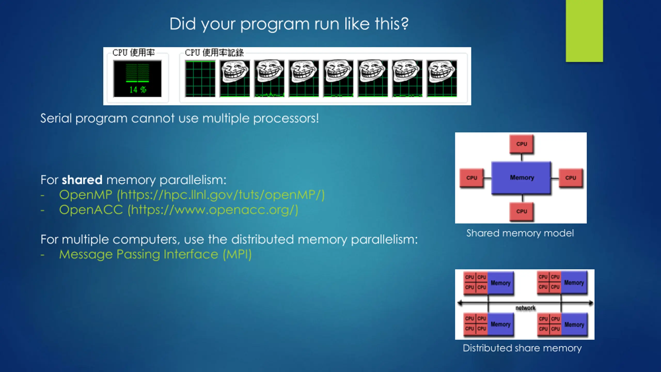 Did your program run like this? Serial program cannot use multiple processors! For shared memory parallelism: - OpenMP (https://hpc.llnl.gov/tuts/openMP/) - OpenACC (https://www.openacc.org/) Shared memory model For multiple computers, use the distributed memory parallelism: - Message Passing Interface (MPI) Distributed share memory