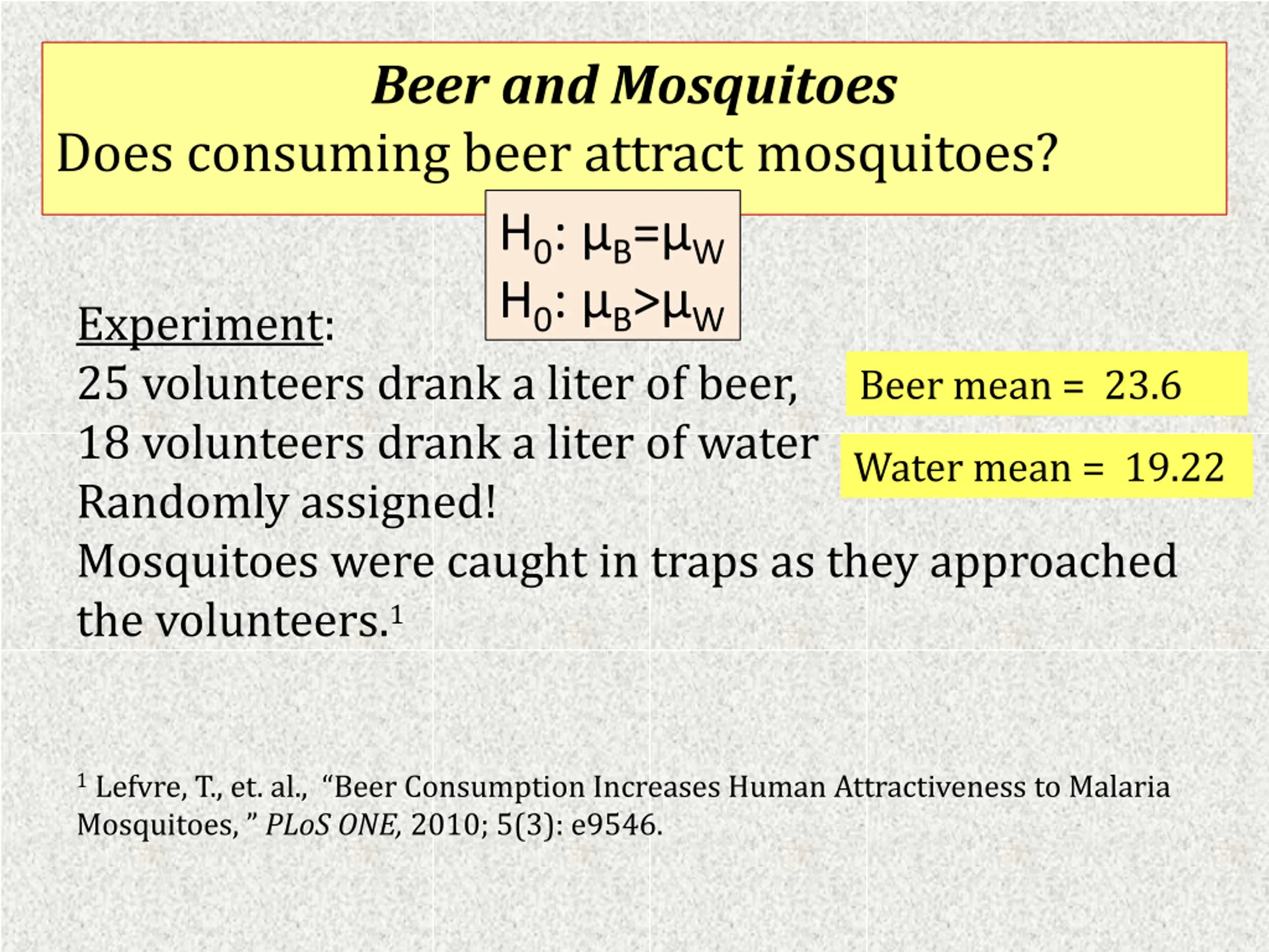 Beer and Mosquitoes Does consuming beer attract mosquitoes? H0: B= W H0: B> W Experiment: 25 volunteers drank a liter of beer, 18 volunteers drank a liter of water Randomly assigned! Mosquitoes were caught in traps as they approached the volunteers.1 Beer mean = 23.6 Water mean = 19.22 1 Lefvre, T., et. al., Beer Consumption Increases Human Attractiveness to Malaria Mosquitoes, PLoS ONE, 2010; 5(3): e9546.