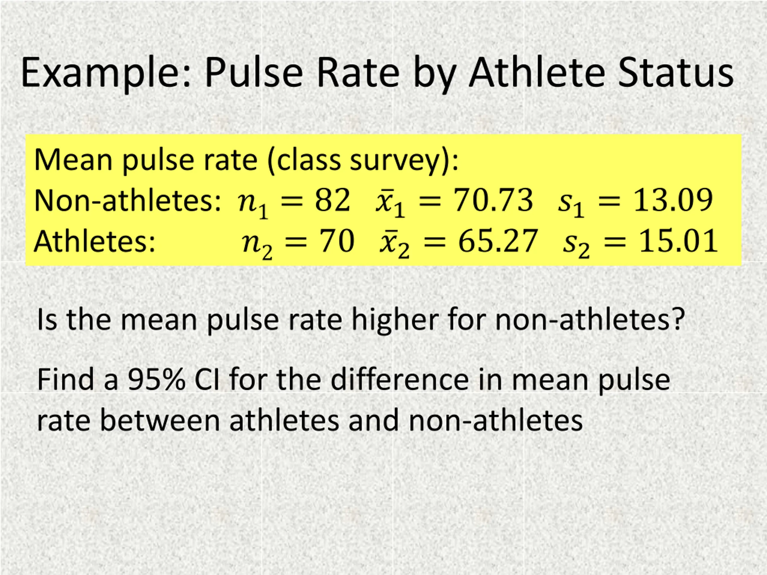 Example: Pulse Rate by Athlete Status Mean pulse rate (class survey): Non-athletes: ?1= 82 ?1= 70.73 ?1= 13.09 Athletes: ?2= 70 ?2= 65.27 ?2= 15.01 Is the mean pulse rate higher for non-athletes? Find a 95% CI for the difference in mean pulse rate between athletes and non-athletes