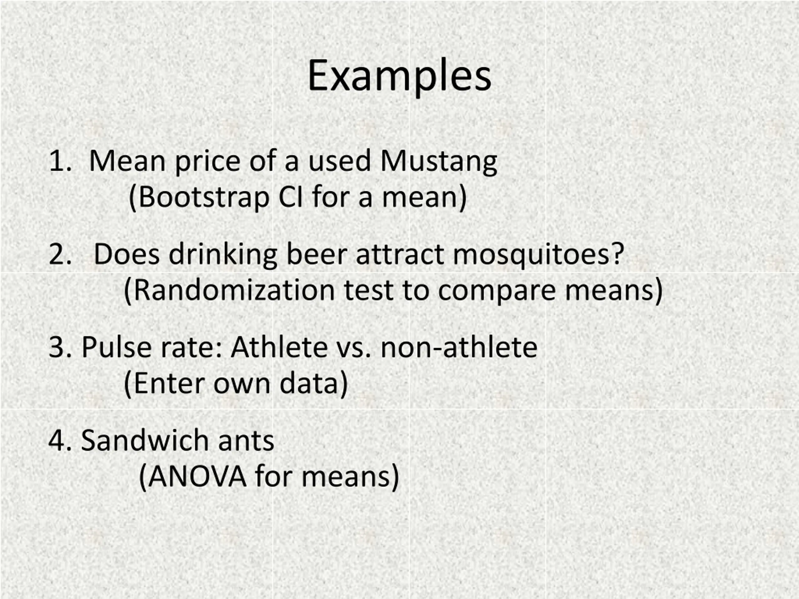 Examples 1. Mean price of a used Mustang (Bootstrap CI for a mean) 2. Does drinking beer attract mosquitoes? (Randomization test to compare means) 3. Pulse rate: Athlete vs. non-athlete (Enter own data) 4. Sandwich ants (ANOVA for means)
