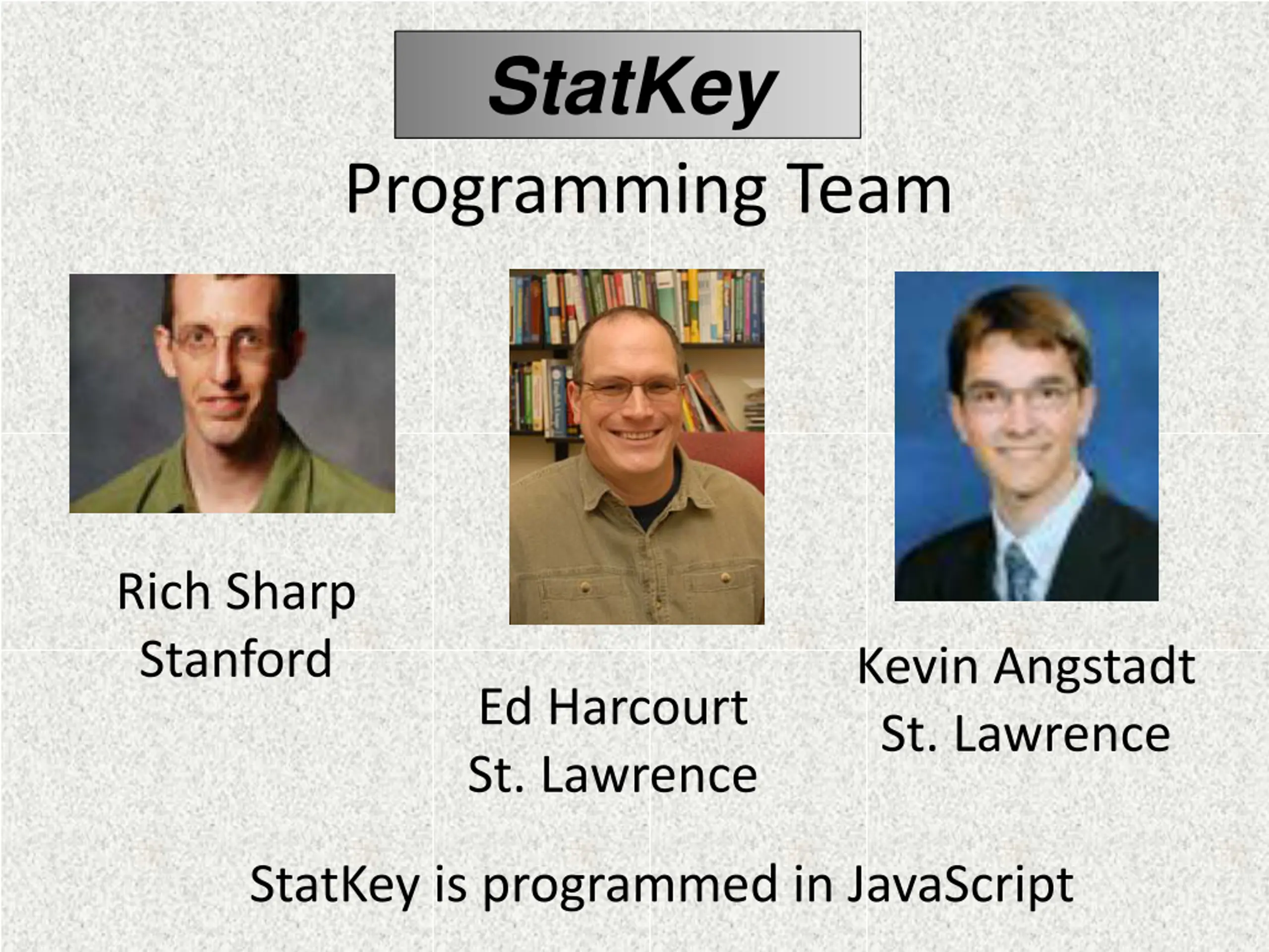 StatKey Programming Team Rich Sharp Stanford Kevin Angstadt St. Lawrence Ed Harcourt St. Lawrence StatKey is programmed in JavaScript