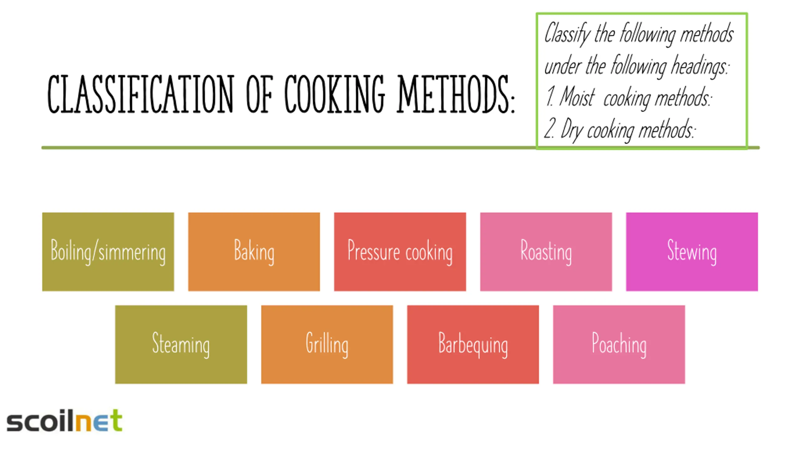 Classify the following methods under the following headings: 1. Moist cooking methods: 2. Dry cooking methods: Classification of cooking methods: Boiling/simmering Baking Pressure cooking Roasting Stewing Steaming Grilling Barbequing Poaching