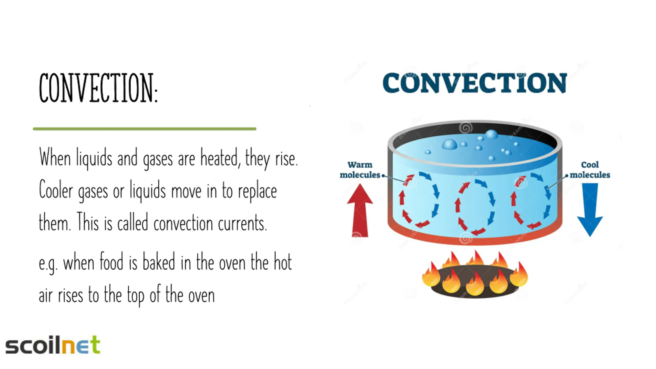 Convection: When liquids and gases are heated, they rise. Cooler gases or liquids move in to replace them. This is called convection currents. e.g. when food is baked in the oven the hot air rises to the top of the oven