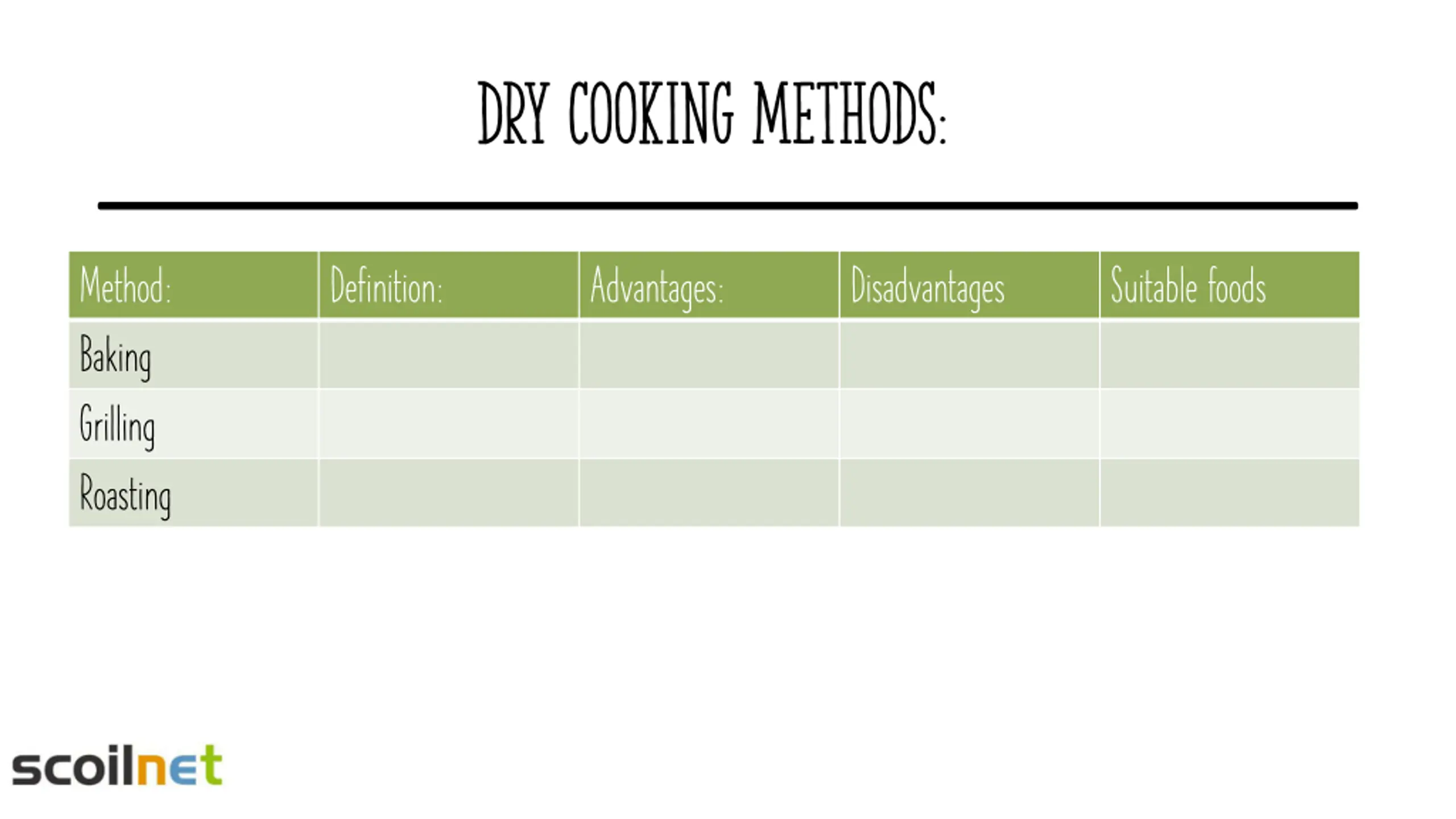 Dry Cooking methods: Method: Baking Grilling Roasting Definition: Advantages: Disadvantages Suitable foods