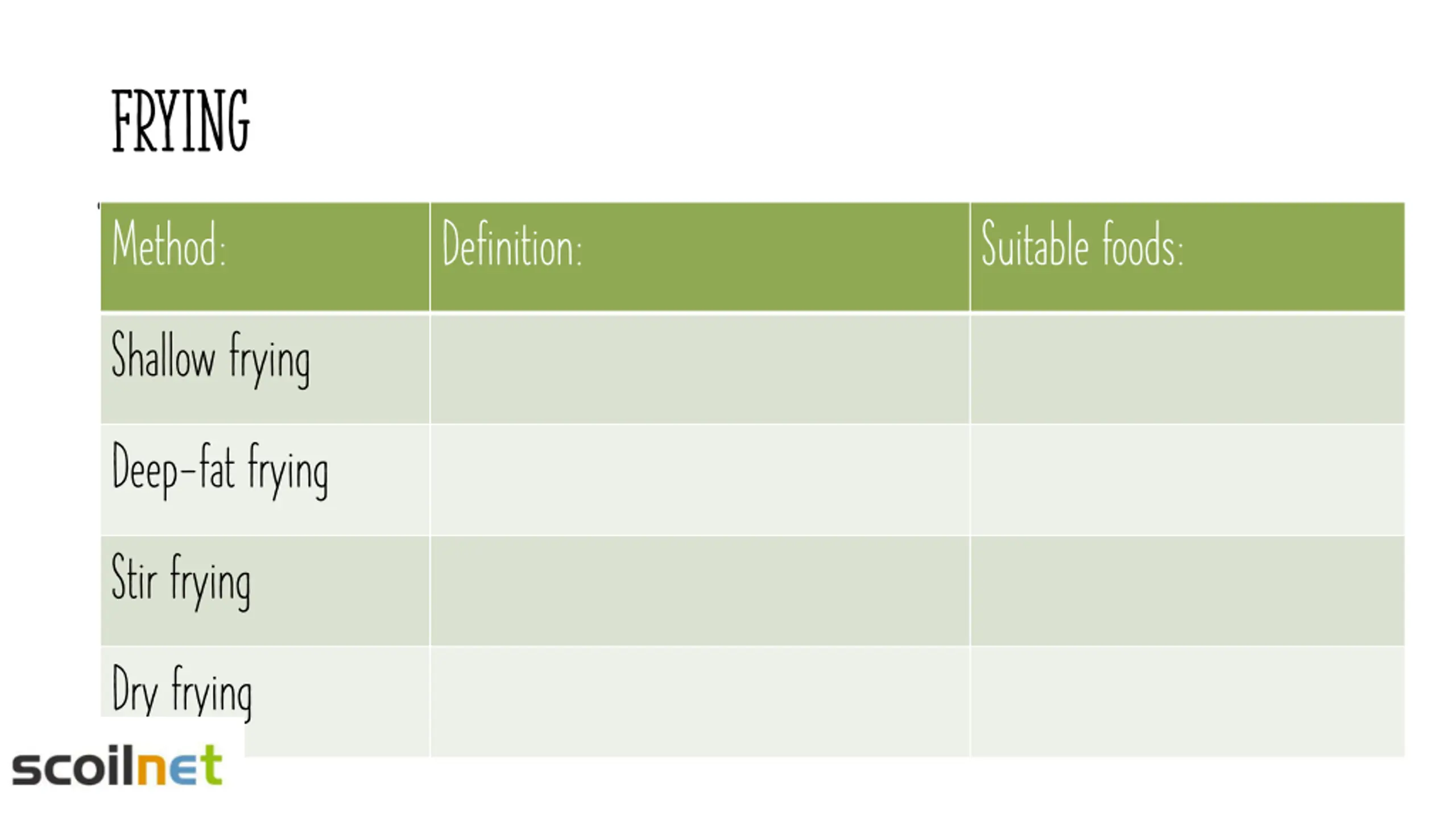 Frying Method: Definition: Suitable foods: Shallow frying Deep-fat frying Stir frying Dry frying