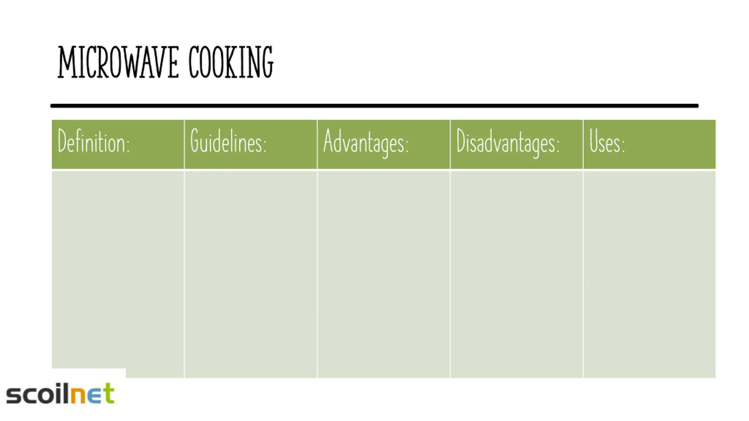 Microwave cooking Definition: Guidelines: Advantages: Disadvantages: Uses: