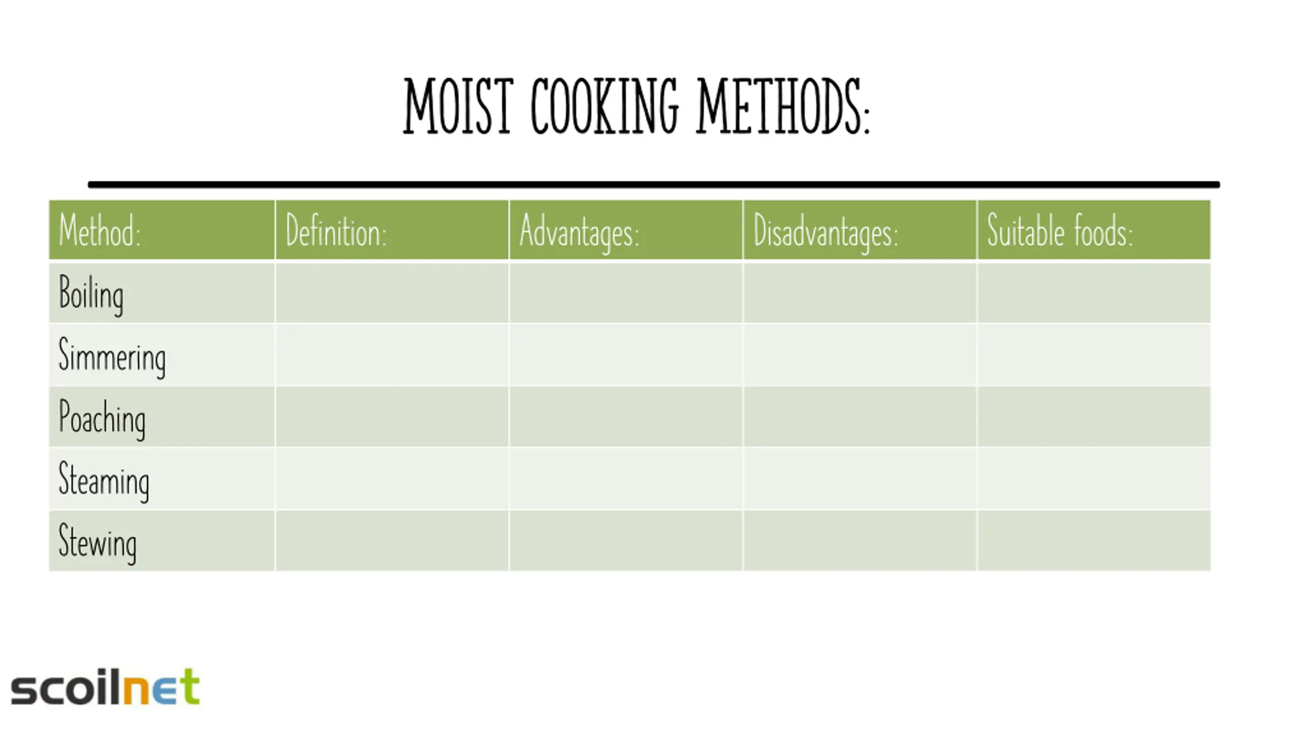 Moist Cooking methods: Method: Boiling Simmering Poaching Steaming Stewing Definition: Advantages: Disadvantages: Suitable foods: