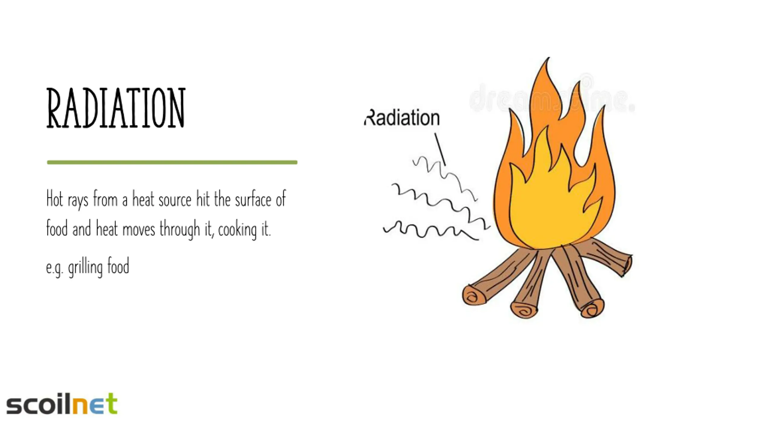 Radiation Hot rays from a heat source hit the surface of food and heat moves through it, cooking it. e.g. grilling food