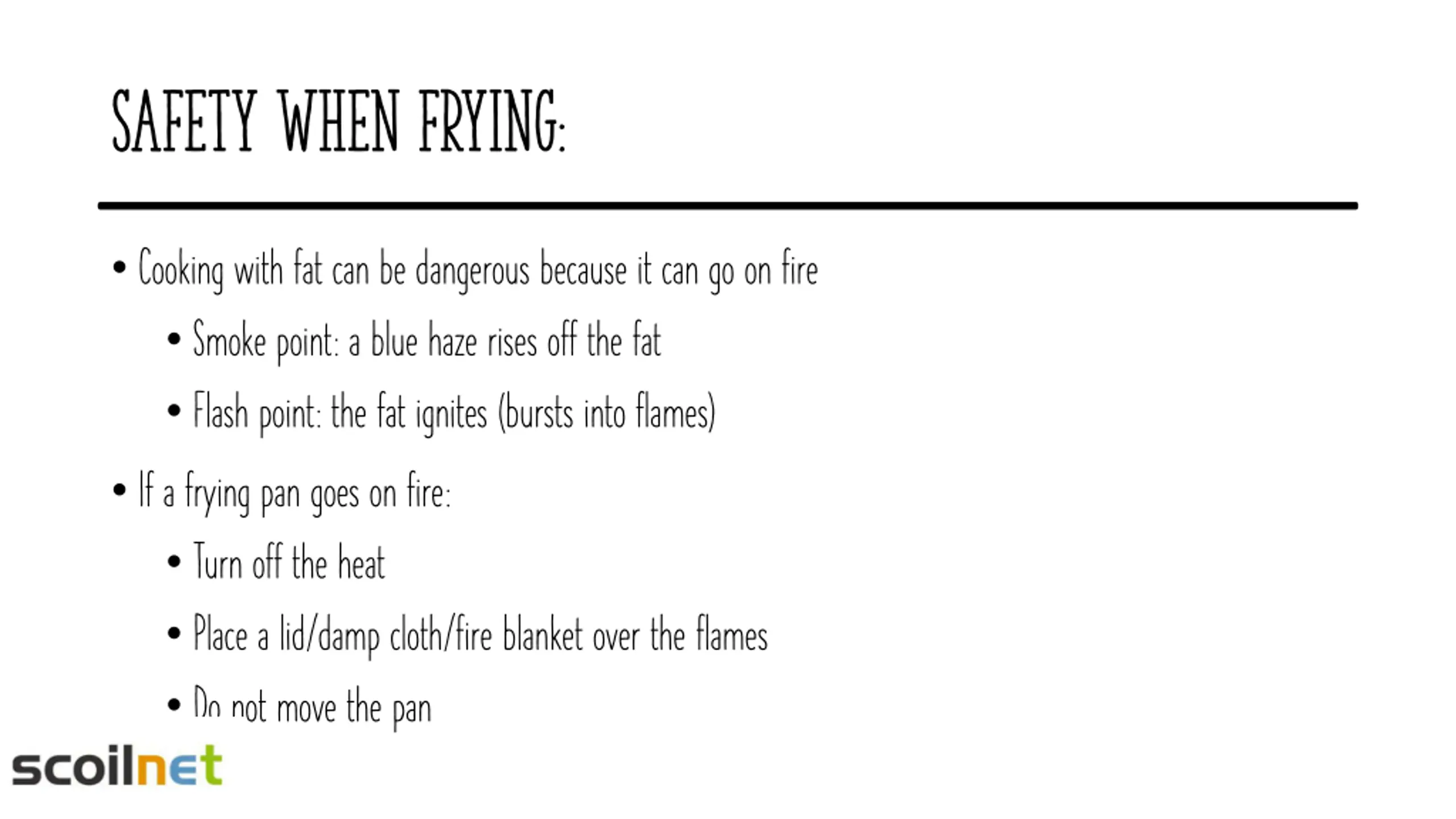 Safety when frying: Cooking with fat can be dangerous because it can go on fire Smoke point: a blue haze rises off the fat Flash point: the fat ignites (bursts into flames) If a frying pan goes on fire: Turn off the heat Place a lid/damp cloth/fire blanket over the flames Do not move the pan https:/