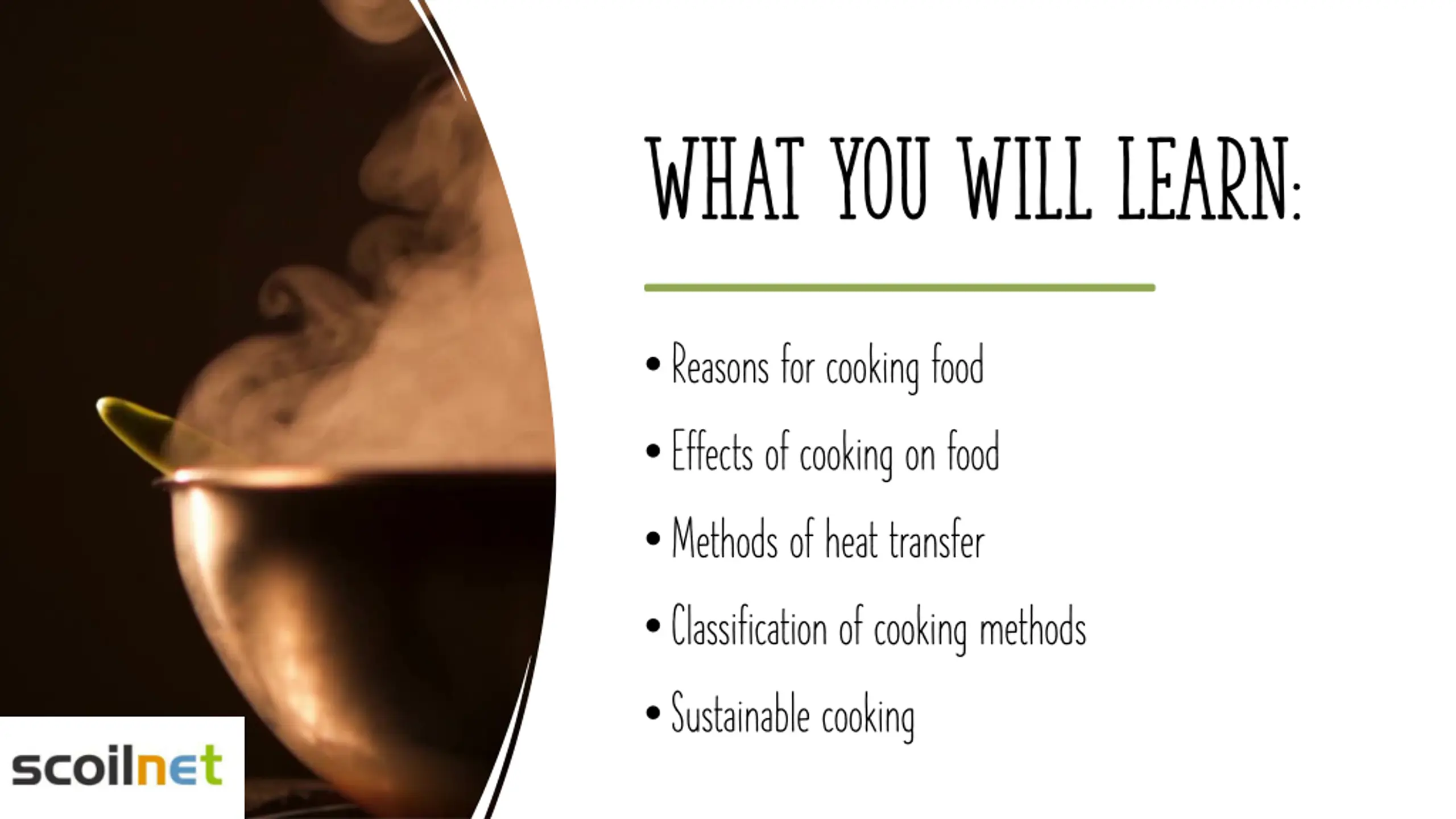 What you will learn: Reasons for cooking food Effects of cooking on food Methods of heat transfer Classification of cooking methods Sustainable cooking