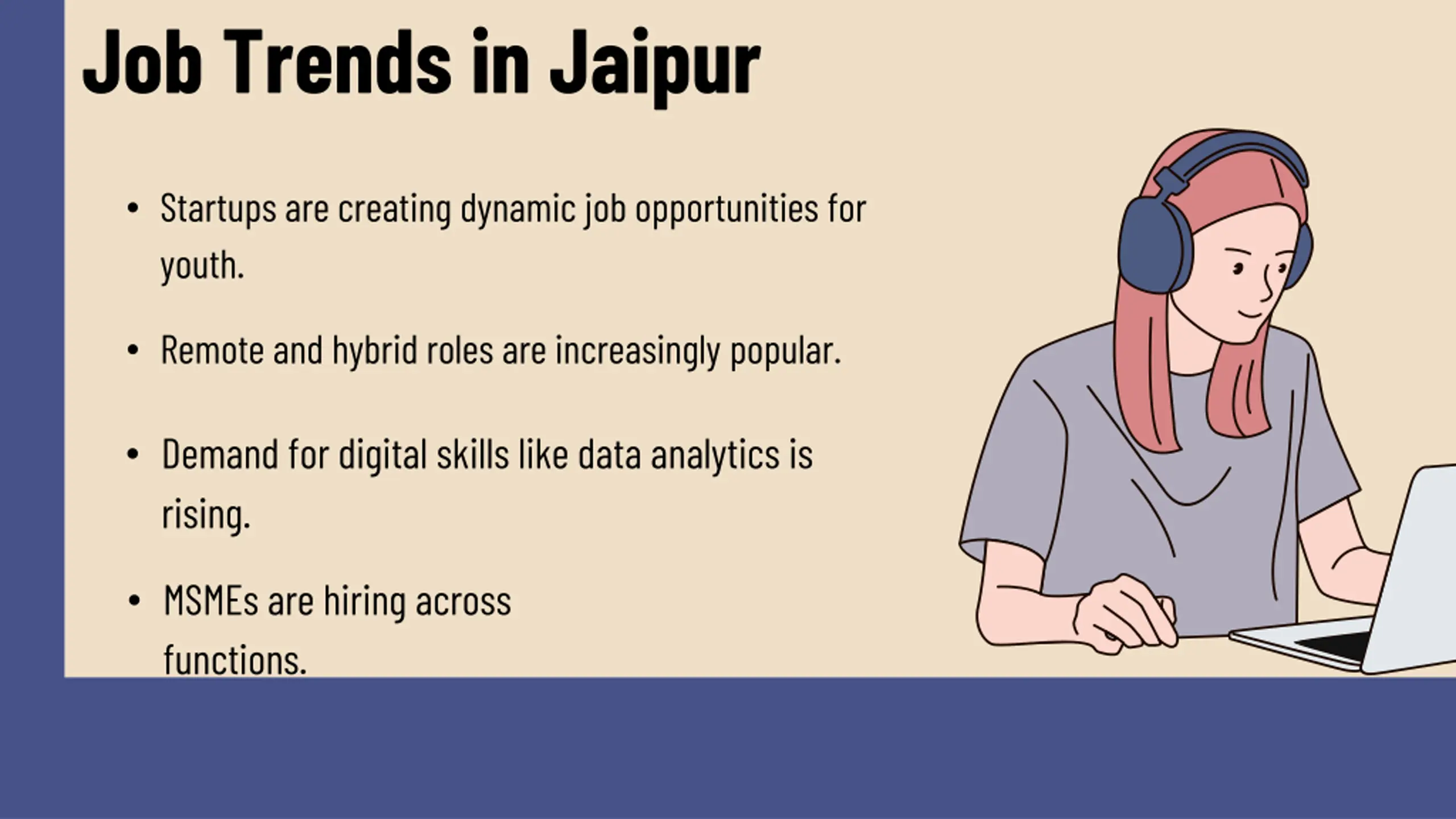 Job Trends in Jaipur Startups are creating dynamic job opportunities for youth. Remote and hybrid roles are increasingly popular. Demand for digital skills like data analytics is rising. MSMEs are hiring across functions.