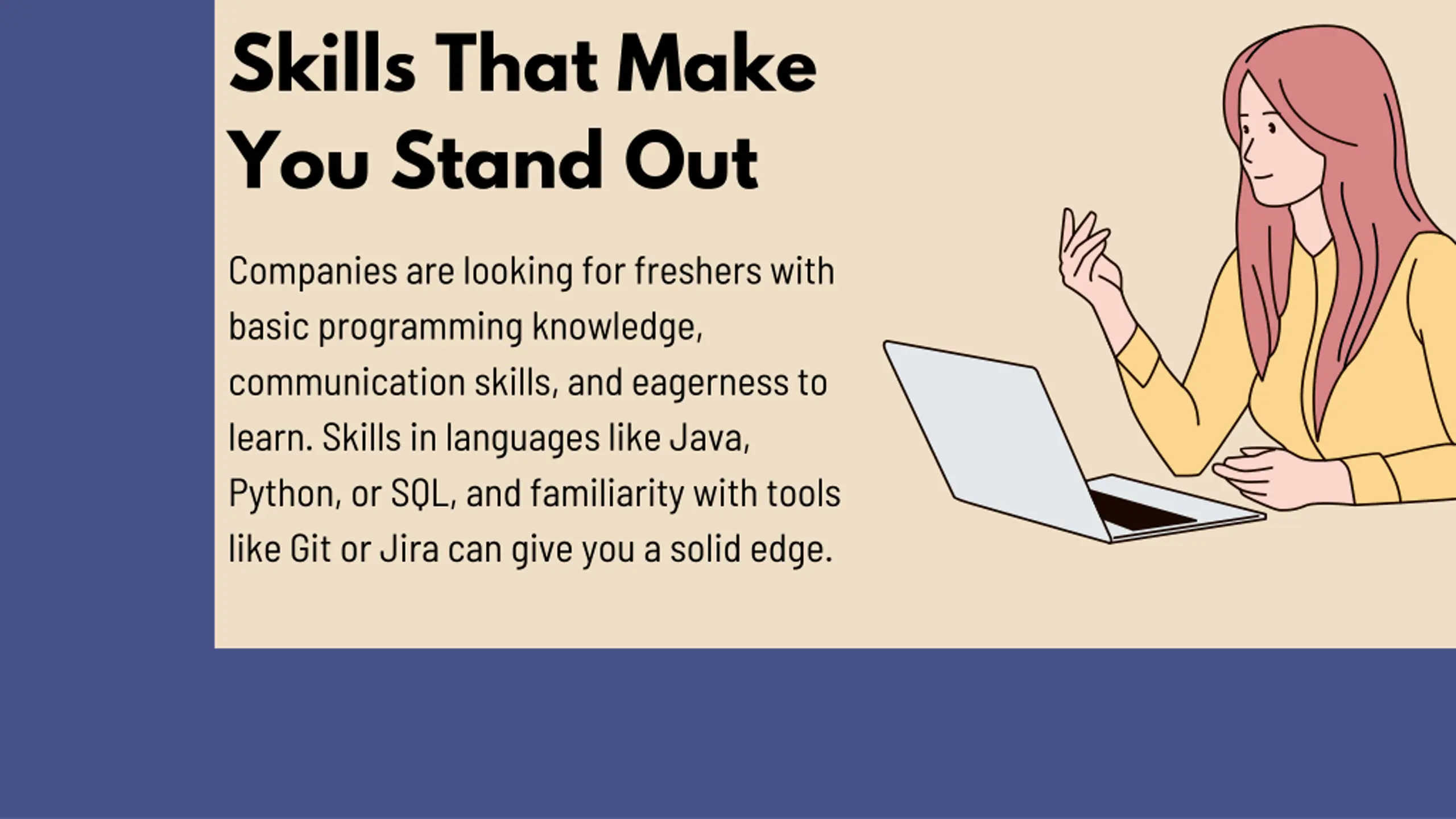 Skills That Make You Stand Out Companies are looking for freshers with basic programming knowledge, communication skills, and eagerness to learn. Skills in languages like Java, Python, or SQL, and familiarity with tools like Git or Jira can give you a solid edge.