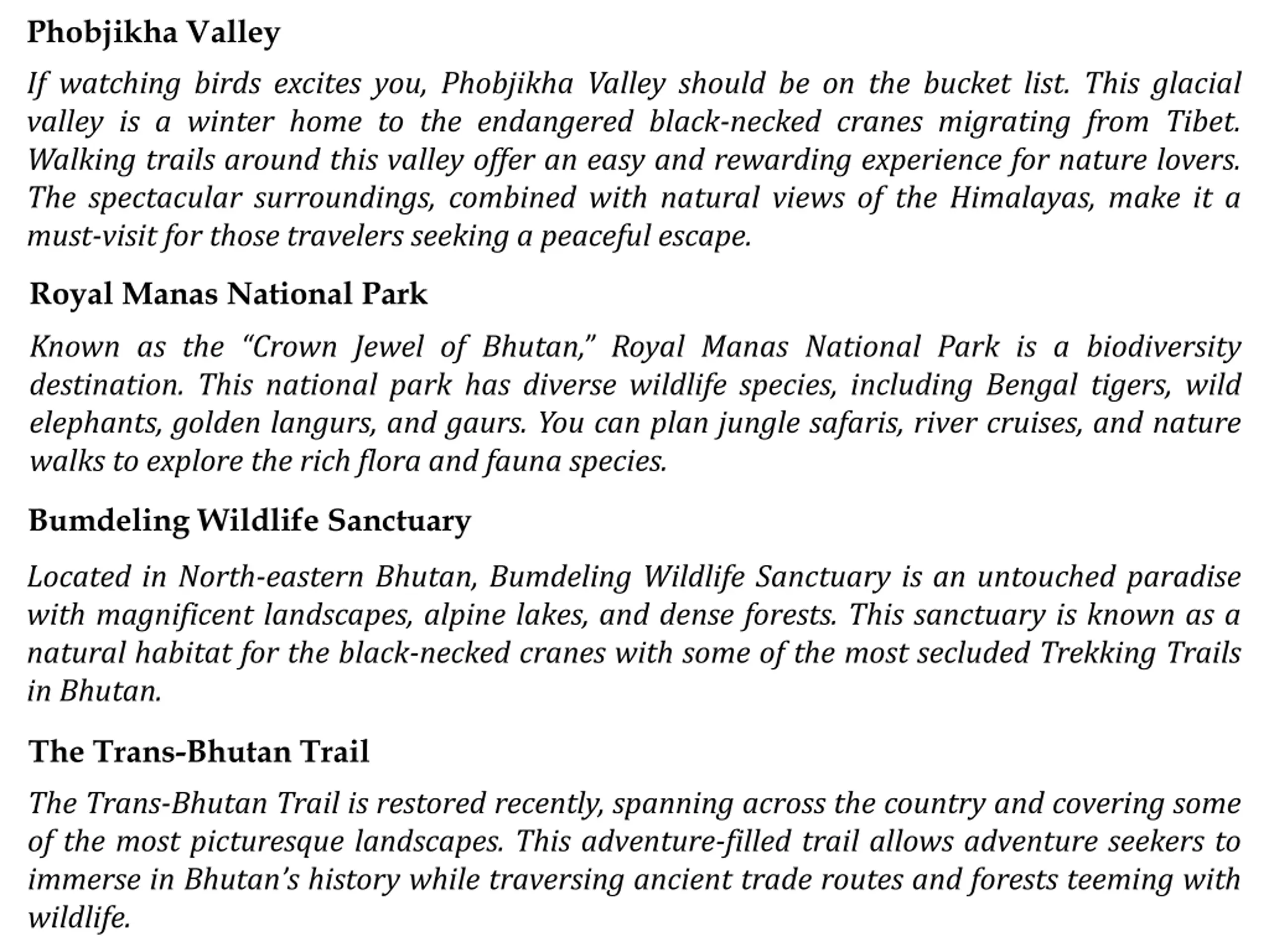 Phobjikha Valley If watching birds excites you, Phobjikha Valley should be on the bucket list. This glacial valley is a winter home to the endangered black-necked cranes migrating from Tibet. Walking trails around this valley offer an easy and rewarding experience for nature lovers. The spectacular surroundings, combined with natural views of the Himalayas, make it a must-visit for those travelers seeking a peaceful escape. Royal Manas National Park Known as the Crown Jewel of Bhutan, Royal Manas National Park is a biodiversity destination. This national park has diverse wildlife species, including Bengal tigers, wild elephants, golden langurs, and gaurs. You can plan jungle safaris, river cruises, and nature walks to explore the rich flora and fauna species. Bumdeling Wildlife Sanctuary Located in North-eastern Bhutan, Bumdeling Wildlife Sanctuary is an untouched paradise with magnificent landscapes, alpine lakes, and dense forests. This sanctuary is known as a natural habitat for the black-necked cranes with some of the most secluded Trekking Trails in Bhutan. The Trans-Bhutan Trail The Trans-Bhutan Trail is restored recently, spanning across the country and covering some of the most picturesque landscapes. This adventure-filled trail allows adventure seekers to immerse in Bhutan s history while traversing ancient trade routes and forests teeming with wildlife.
