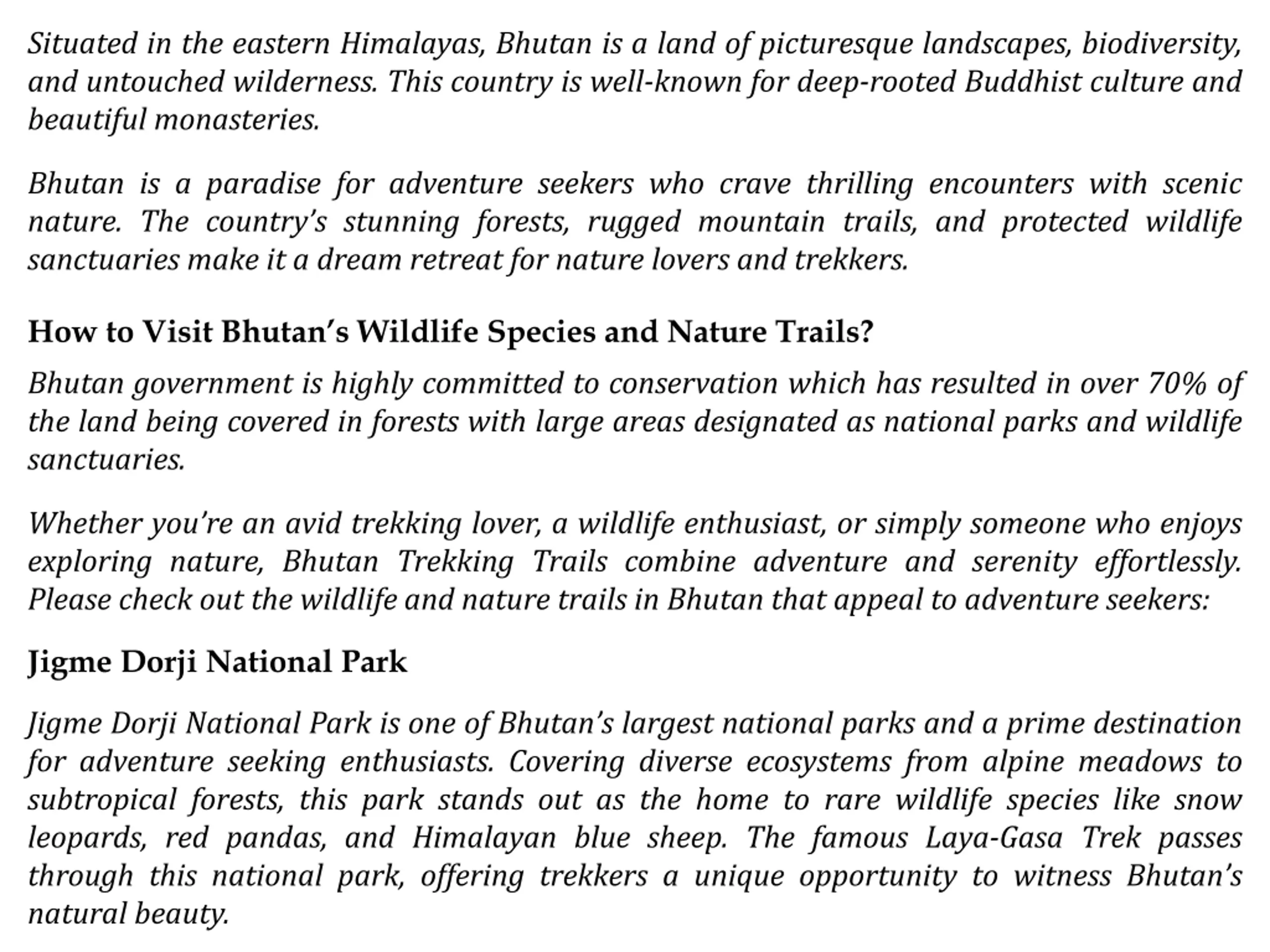 Situated in the eastern Himalayas, Bhutan is a land of picturesque landscapes, biodiversity, and untouched wilderness. This country is well-known for deep-rooted Buddhist culture and beautiful monasteries. Bhutan is a paradise for adventure seekers who crave thrilling encounters with scenic nature. The country s stunning forests, rugged mountain trails, and protected wildlife sanctuaries make it a dream retreat for nature lovers and trekkers. How to Visit Bhutan s Wildlife Species and Nature Trails? Bhutan government is highly committed to conservation which has resulted in over 70% of the land being covered in forests with large areas designated as national parks and wildlife sanctuaries. Whether you re an avid trekking lover, a wildlife enthusiast, or simply someone who enjoys exploring nature, Bhutan Trekking Trails combine adventure and serenity effortlessly. Please check out the wildlife and nature trails in Bhutan that appeal to adventure seekers: Jigme Dorji National Park Jigme Dorji National Park is one of Bhutan s largest national parks and a prime destination for adventure seeking enthusiasts. Covering diverse ecosystems from alpine meadows to subtropical forests, this park stands out as the home to rare wildlife species like snow leopards, red pandas, and Himalayan blue sheep. The famous Laya-Gasa Trek passes through this national park, offering trekkers a unique opportunity to witness Bhutan s natural beauty.
