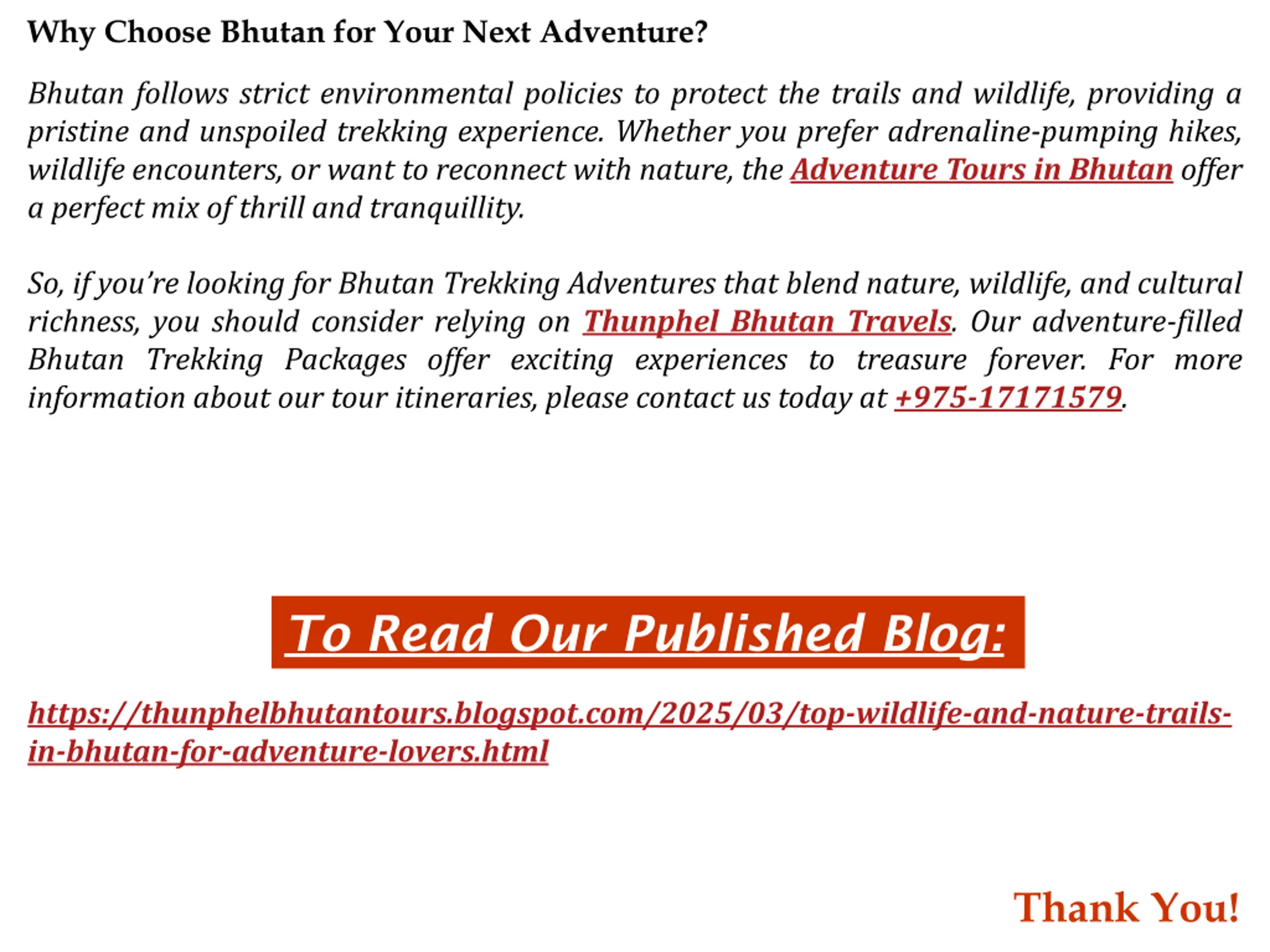 Why Choose Bhutan for Your Next Adventure? Bhutan follows strict environmental policies to protect the trails and wildlife, providing a pristine and unspoiled trekking experience. Whether you prefer adrenaline-pumping hikes, wildlife encounters, or want to reconnect with nature, the Adventure Tours in Bhutan offer a perfect mix of thrill and tranquillity. So, if you re looking for Bhutan Trekking Adventures that blend nature, wildlife, and cultural richness, you should consider relying on Thunphel Bhutan Travels. Our adventure-filled Bhutan Trekking Packages offer exciting experiences to treasure forever. For more information about our tour itineraries, please contact us today at +975-17171579. To Read Our Published Blog: https://thunphelbhutantours.blogspot.com/2025/03/top-wildlife-and-nature-trails- in-bhutan-for-adventure-lovers.html Thank You!
