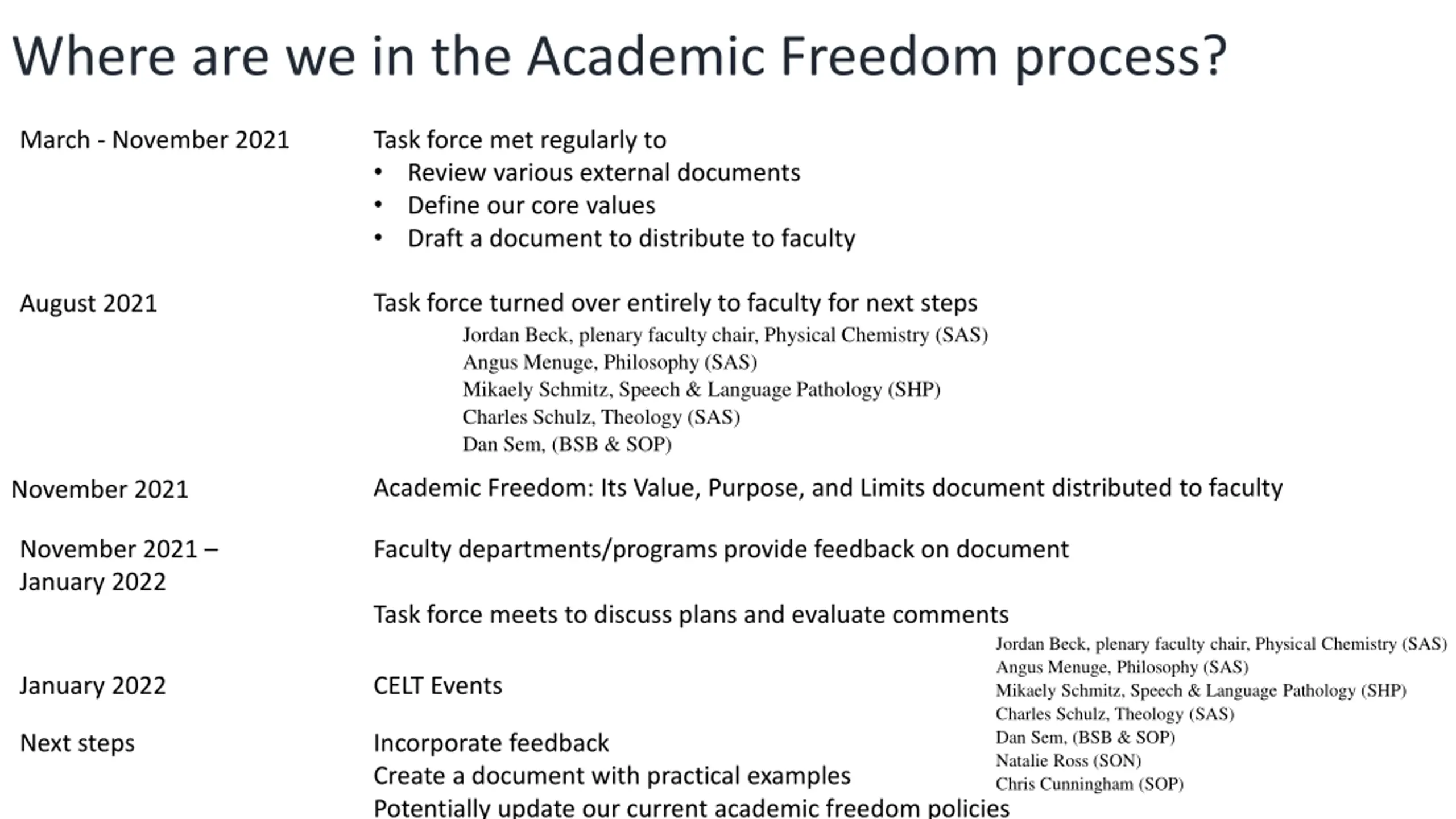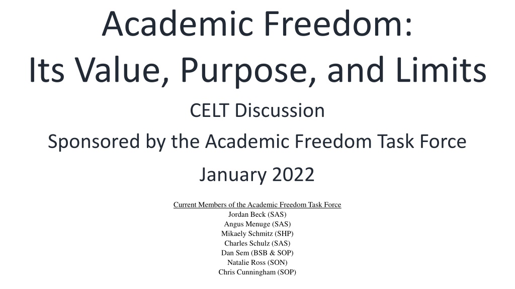 Where are we in the Academic Freedom process? March - November 2021 Task force met regularly to Review various external documents Define our core values Draft a document to distribute to faculty Task force turned over entirely to faculty for next steps Jordan Beck, plenary faculty chair, Physical Chemistry (SAS) Angus Menuge, Philosophy (SAS) Mikaely Schmitz, Speech & Language Pathology (SHP) Charles Schulz, Theology (SAS) Dan Sem, (BSB & SOP) August 2021 Academic Freedom: Its Value, Purpose, and Limits document distributed to faculty November 2021 November 2021 January 2022 Faculty departments/programs provide feedback on document Task force meets to discuss plans and evaluate comments Jordan Beck, plenary faculty chair, Physical Chemistry (SAS) Angus Menuge, Philosophy (SAS) Mikaely Schmitz, Speech & Language Pathology (SHP) Charles Schulz, Theology (SAS) Dan Sem, (BSB & SOP) Natalie Ross (SON) Chris Cunningham (SOP) January 2022 CELT Events Next steps Incorporate feedback Create a document with practical examples Potentially update our current academic freedom policies