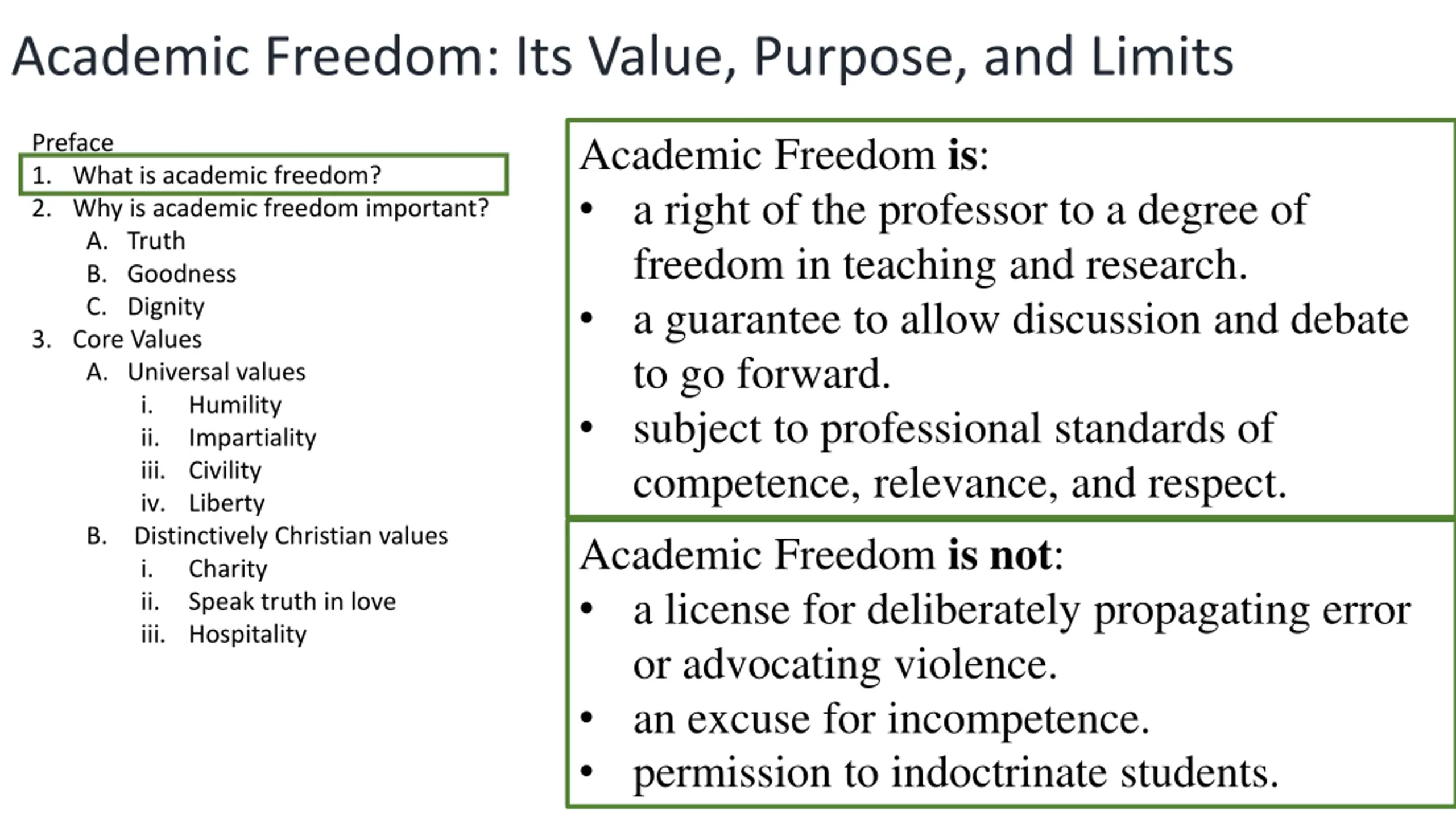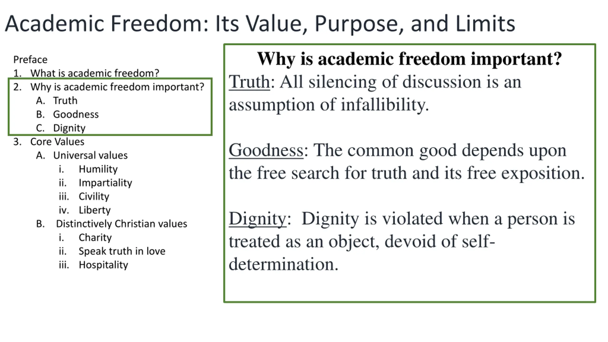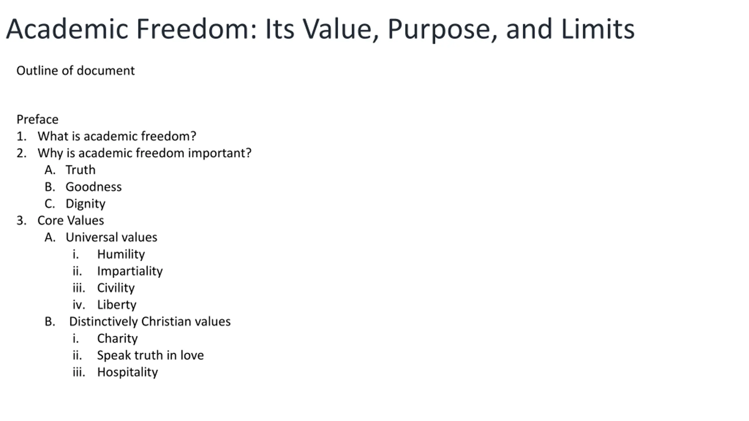 Academic Freedom: Its Value, Purpose, and Limits Outline of document Preface 1. What is academic freedom? 2. Why is academic freedom important? A. Truth B. Goodness C. Dignity 3. Core Values A. Universal values i. Humility ii. Impartiality iii. Civility iv. Liberty B. Distinctively Christian values i. Charity ii. Speak truth in love iii. Hospitality