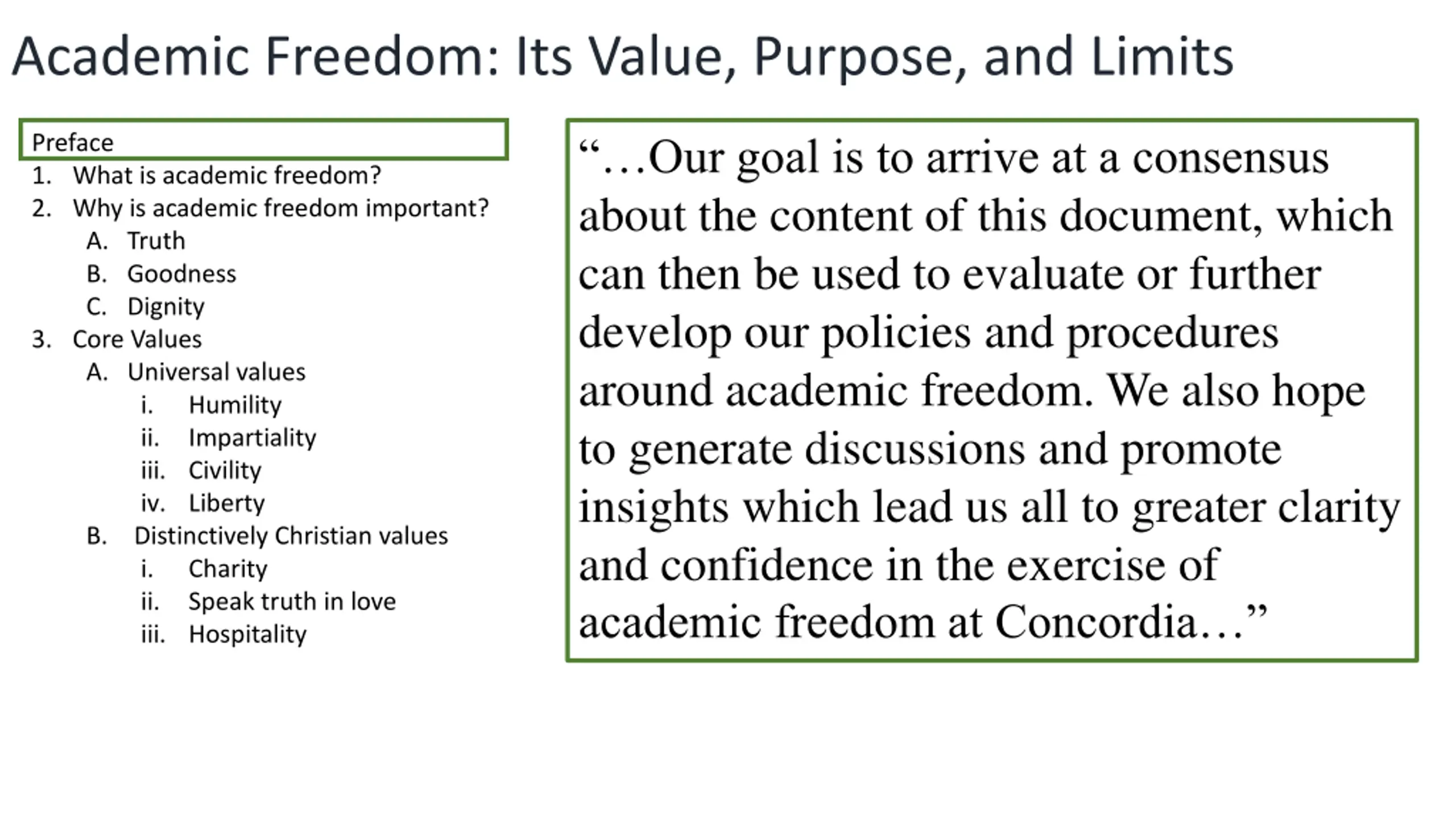 Academic Freedom: Its Value, Purpose, and Limits Our goal is to arrive at a consensus about the content of this document, which can then be used to evaluate or further develop our policies and procedures around academic freedom. We also hope to generate discussions and promote insights which lead us all to greater clarity and confidence in the exercise of academic freedom at Concordia Preface 1. What is academic freedom? 2. Why is academic freedom important? A. Truth B. Goodness C. Dignity 3. Core Values A. Universal values i. Humility ii. Impartiality iii. Civility iv. Liberty B. Distinctively Christian values i. Charity ii. Speak truth in love iii. Hospitality