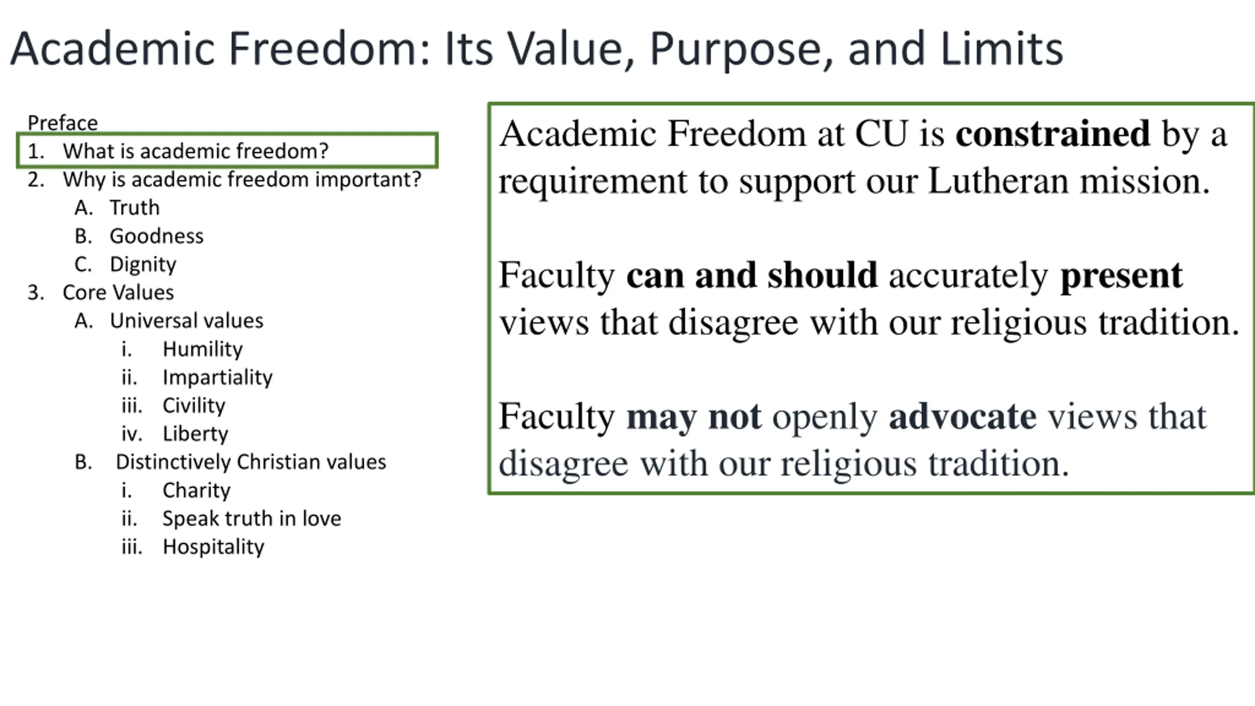 Academic Freedom: Its Value, Purpose, and Limits Academic Freedom at CU is constrained by a requirement to support our Lutheran mission. Preface 1. What is academic freedom? 2. Why is academic freedom important? A. Truth B. Goodness C. Dignity 3. Core Values A. Universal values i. Humility ii. Impartiality iii. Civility iv. Liberty B. Distinctively Christian values i. Charity ii. Speak truth in love iii. Hospitality Faculty can and should accurately present views that disagree with our religious tradition. Faculty may not openly advocate views that disagree with our religious tradition.