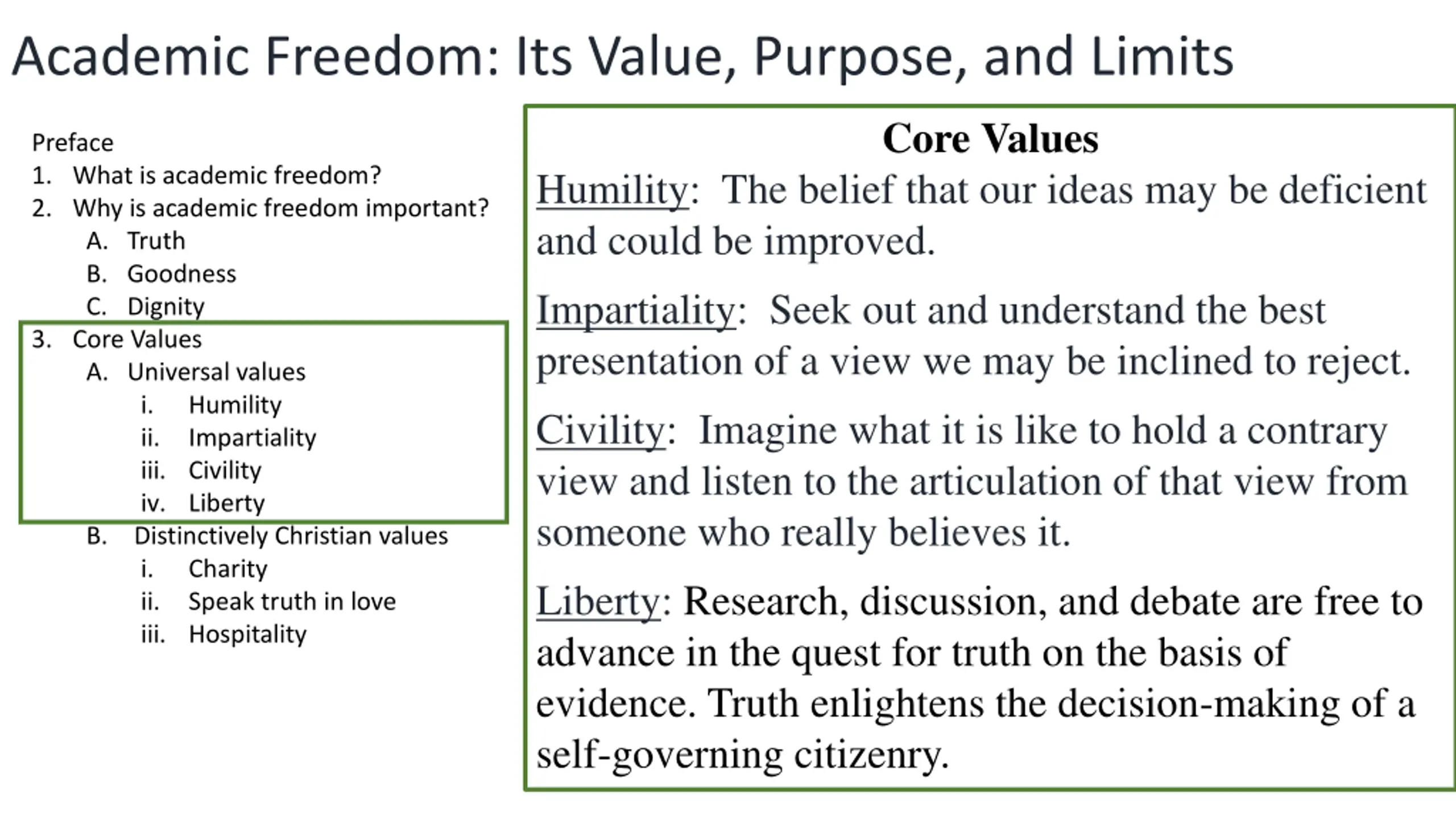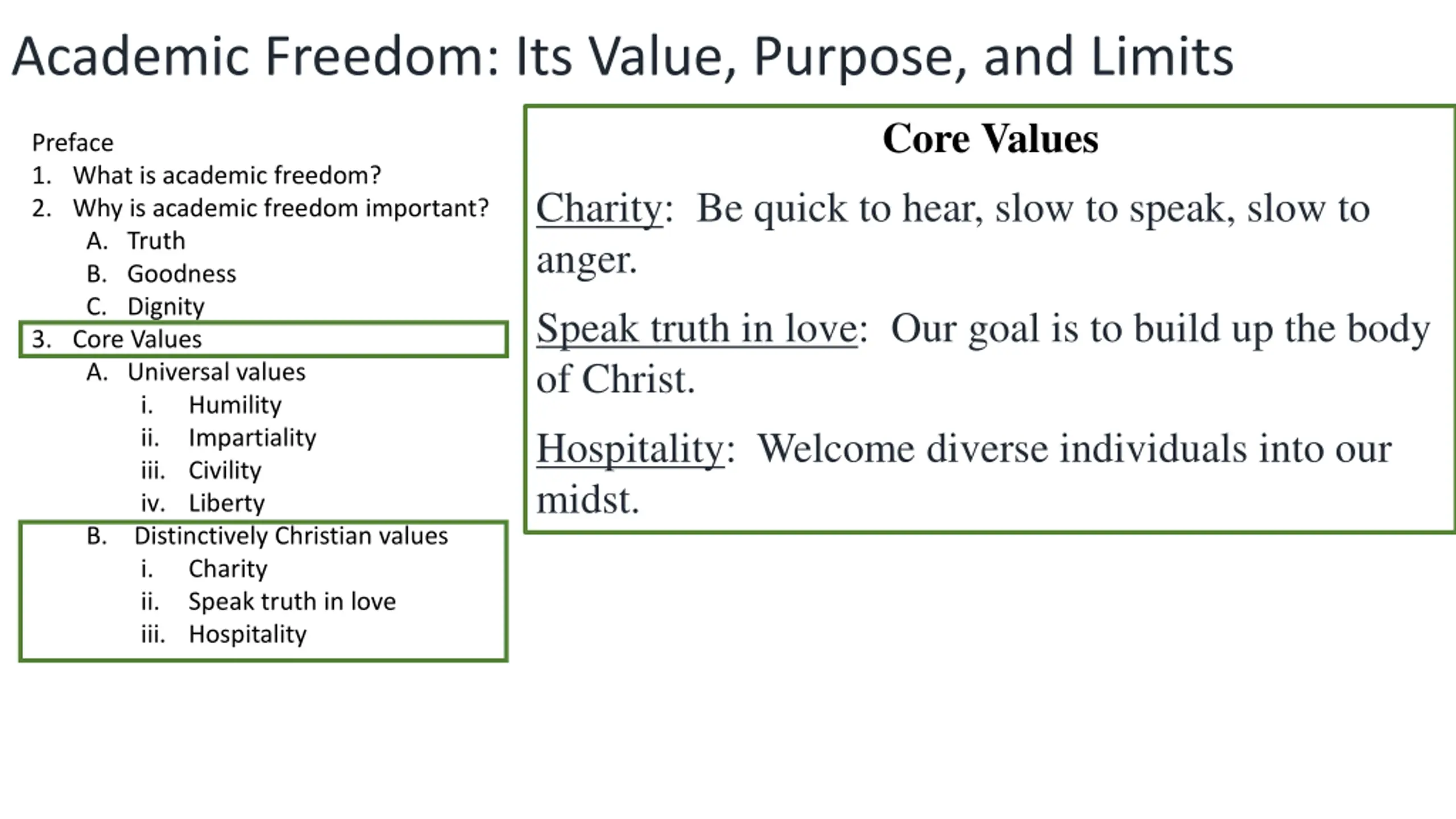Academic Freedom: Its Value, Purpose, and Limits Core Values Preface 1. What is academic freedom? 2. Why is academic freedom important? A. Truth B. Goodness C. Dignity 3. Core Values A. Universal values i. Humility ii. Impartiality iii. Civility iv. Liberty B. Distinctively Christian values i. Charity ii. Speak truth in love iii. Hospitality Charity: Be quick to hear, slow to speak, slow to anger. Speak truth in love: Our goal is to build up the body of Christ. Hospitality: Welcome diverse individuals into our midst.