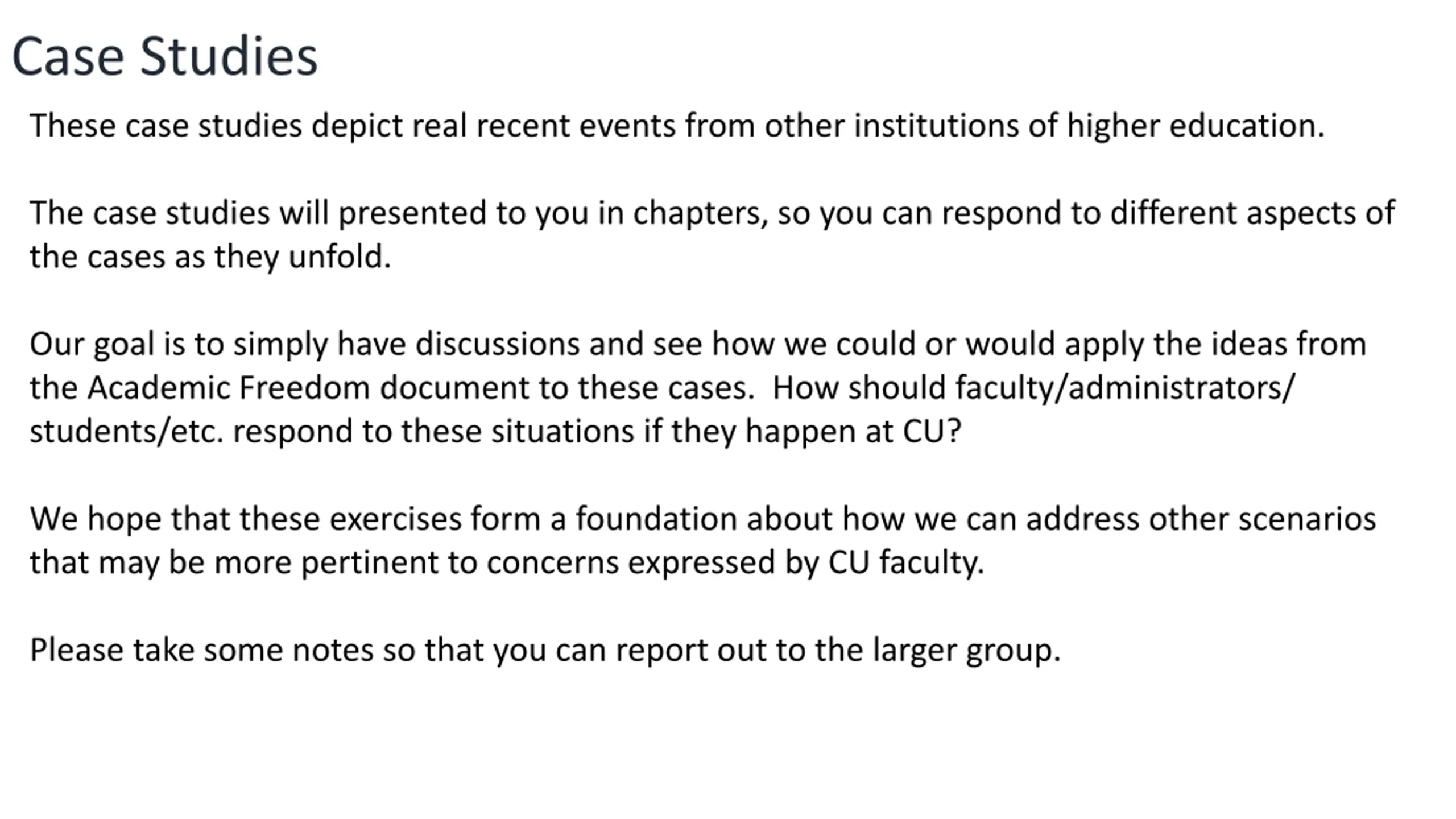 Case Studies These case studies depict real recent events from other institutions of higher education. The case studies will presented to you in chapters, so you can respond to different aspects of the cases as they unfold. Our goal is to simply have discussions and see how we could or would apply the ideas from the Academic Freedom document to these cases. How should faculty/administrators/ students/etc. respond to these situations if they happen at CU? We hope that these exercises form a foundation about how we can address other scenarios that may be more pertinent to concerns expressed by CU faculty. Please take some notes so that you can report out to the larger group.