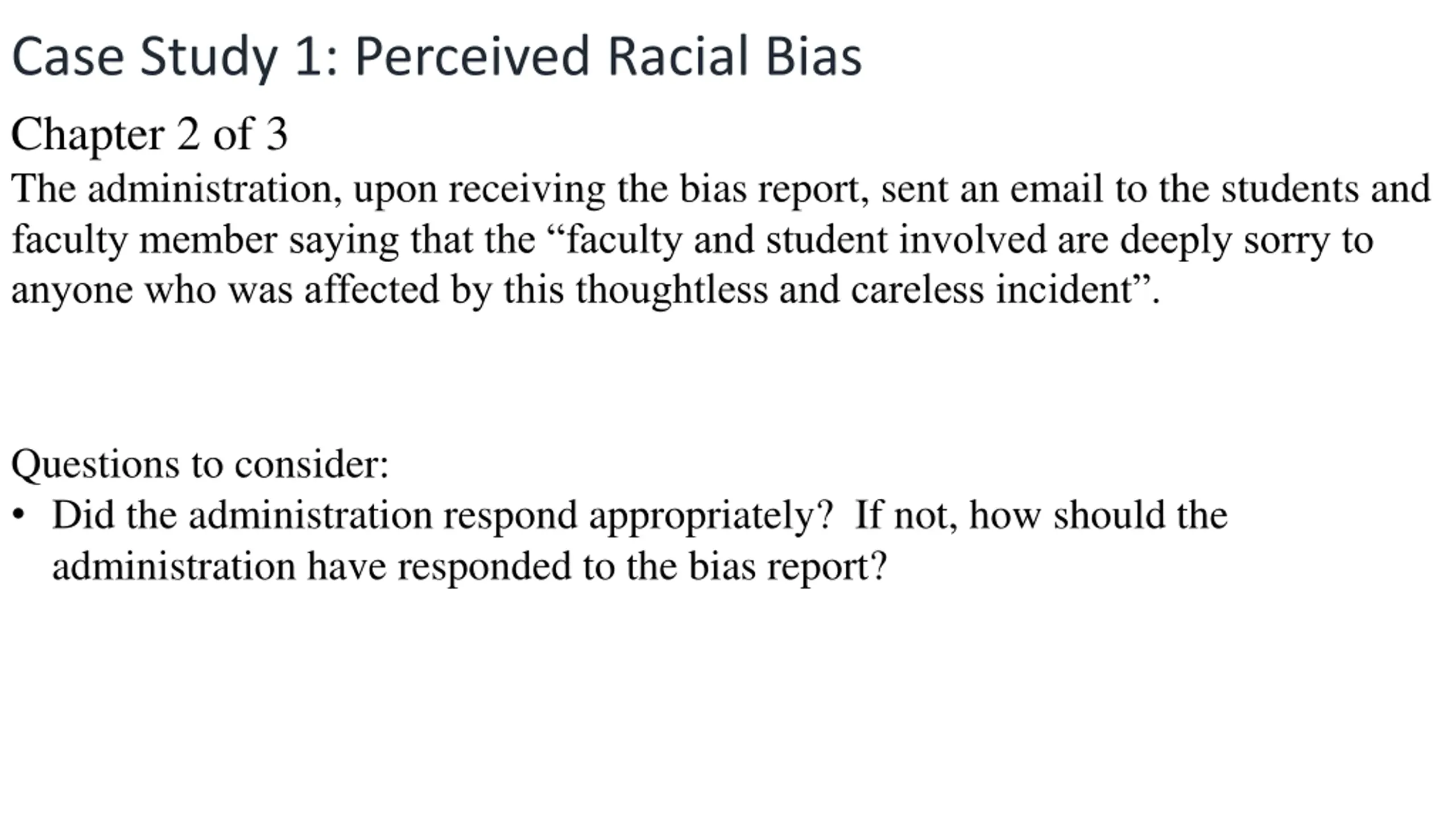 Case Study 1: Perceived Racial Bias Chapter 2 of 3 The administration, upon receiving the bias report, sent an email to the students and faculty member saying that the faculty and student involved are deeply sorry to anyone who was affected by this thoughtless and careless incident . Questions to consider: Did the administration respond appropriately? If not, how should the administration have responded to the bias report?