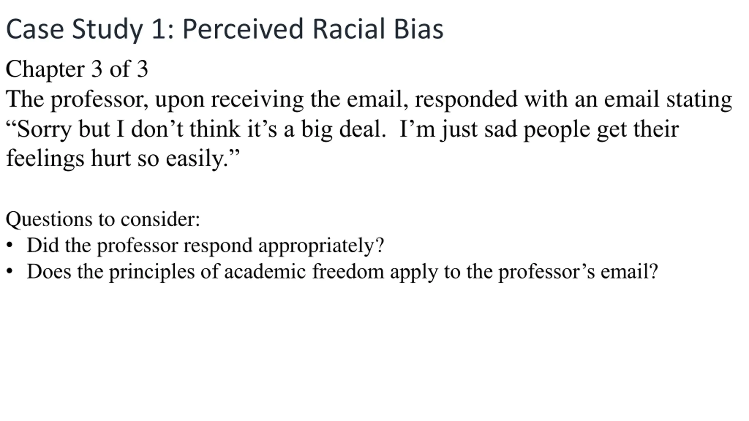 Case Study 1: Perceived Racial Bias Chapter 3 of 3 The professor, upon receiving the email, responded with an email stating Sorry but I don t think it s a big deal. I m just sad people get their feelings hurt so easily. Questions to consider: Did the professor respond appropriately? Does the principles of academic freedom apply to the professor s email?