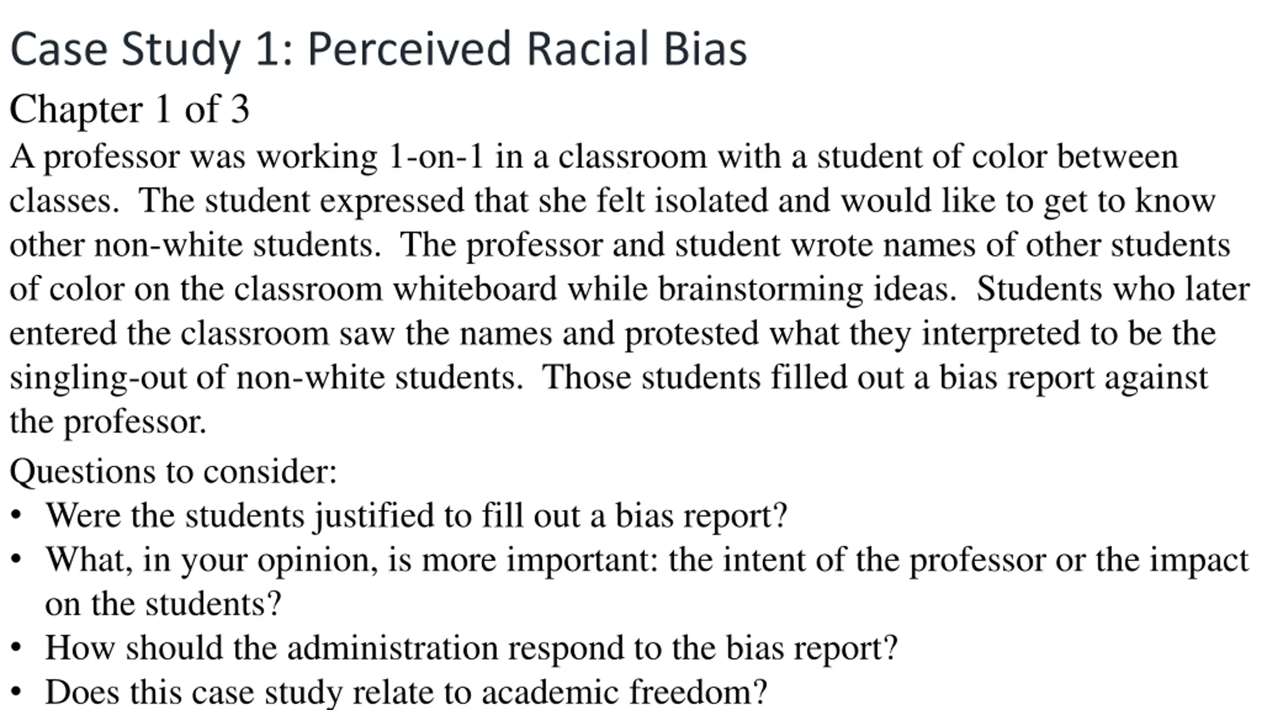 Case Study 1: Perceived Racial Bias Chapter 1 of 3 A professor was working 1-on-1 in a classroom with a student of color between classes. The student expressed that she felt isolated and would like to get to know other non-white students. The professor and student wrote names of other students of color on the classroom whiteboard while brainstorming ideas. Students who later entered the classroom saw the names and protested what they interpreted to be the singling-out of non-white students. Those students filled out a bias report against the professor. Questions to consider: Were the students justified to fill out a bias report? What, in your opinion, is more important: the intent of the professor or the impact on the students? How should the administration respond to the bias report? Does this case study relate to academic freedom?