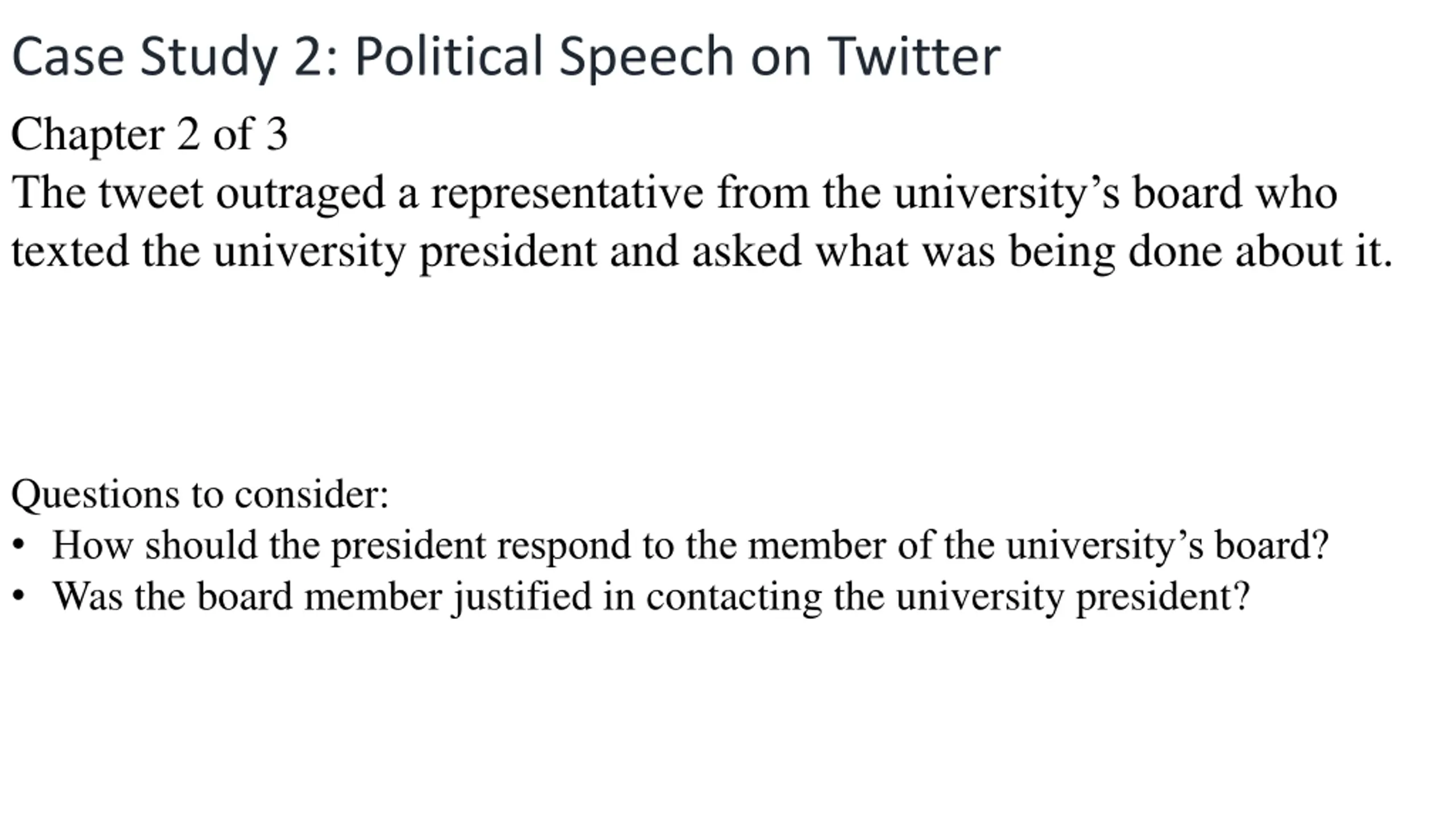 Case Study 2: Political Speech on Twitter Chapter 2 of 3 The tweet outraged a representative from the university s board who texted the university president and asked what was being done about it. Questions to consider: How should the president respond to the member of the university s board? Was the board member justified in contacting the university president?