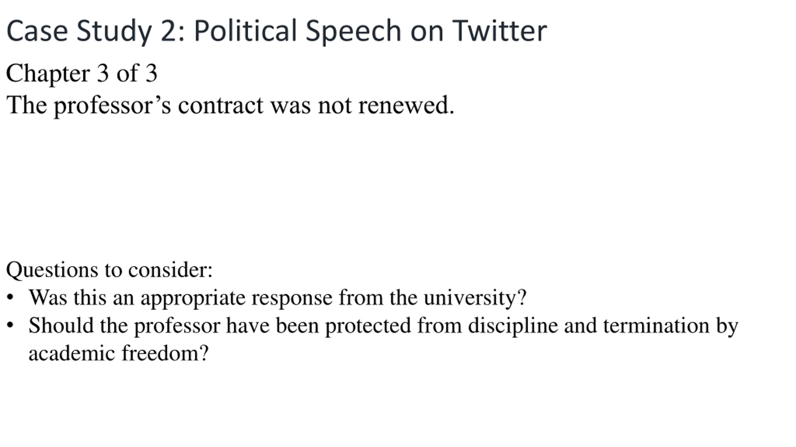 Case Study 2: Political Speech on Twitter Chapter 3 of 3 The professor s contract was not renewed. Questions to consider: Was this an appropriate response from the university? Should the professor have been protected from discipline and termination by academic freedom?
