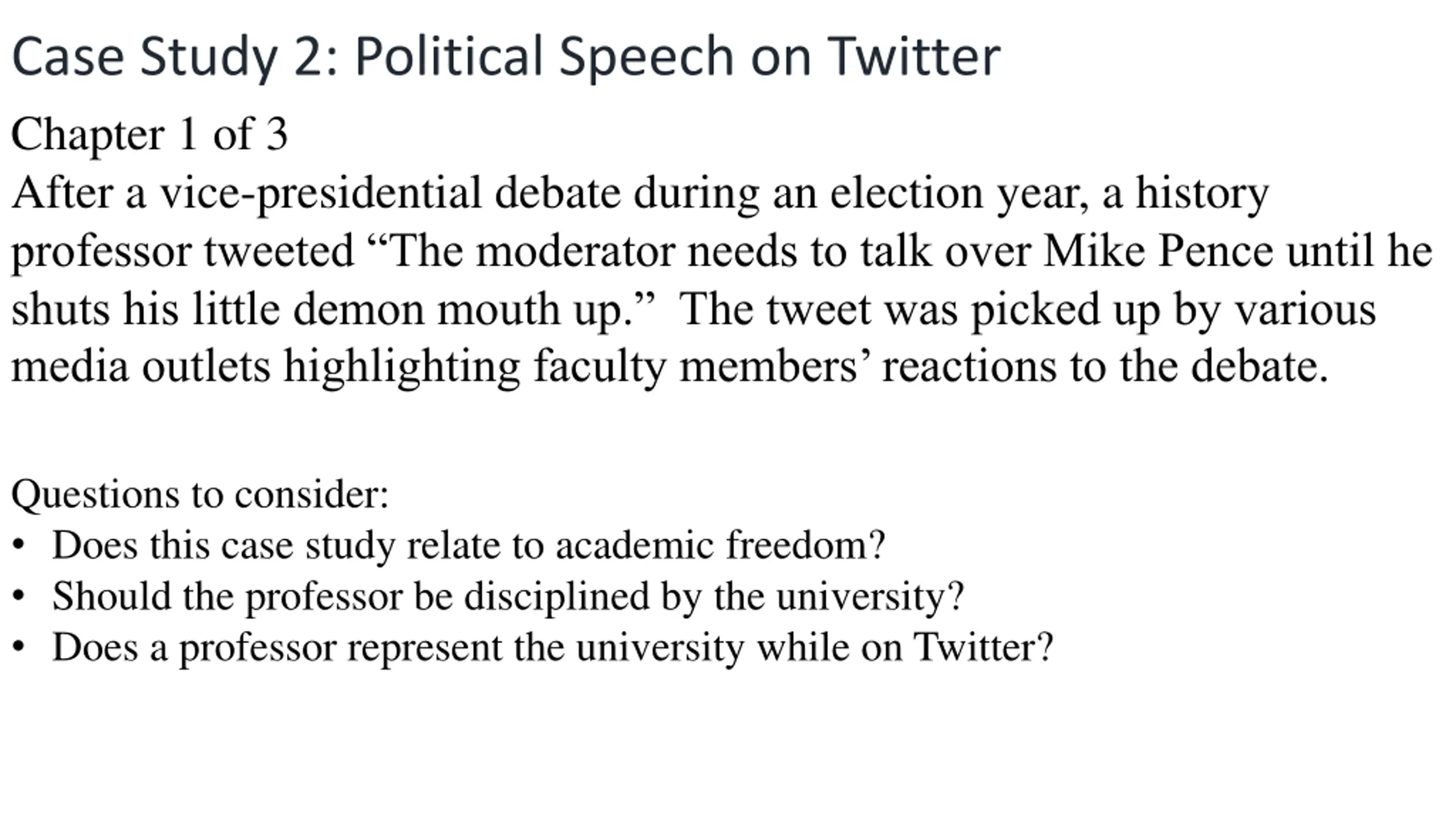Case Study 2: Political Speech on Twitter Chapter 1 of 3 After a vice-presidential debate during an election year, a history professor tweeted The moderator needs to talk over Mike Pence until he shuts his little demon mouth up. The tweet was picked up by various media outlets highlighting faculty members reactions to the debate. Questions to consider: Does this case study relate to academic freedom? Should the professor be disciplined by the university? Does a professor represent the university while on Twitter?