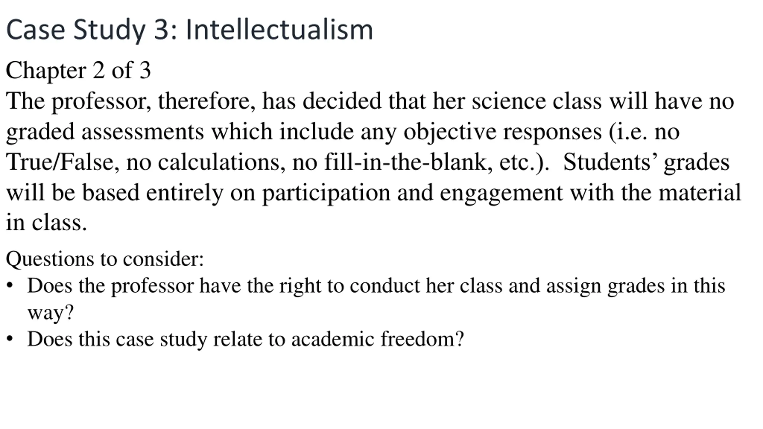 Case Study 3: Intellectualism Chapter 2 of 3 The professor, therefore, has decided that her science class will have no graded assessments which include any objective responses (i.e. no True/False, no calculations, no fill-in-the-blank, etc.). Students grades will be based entirely on participation and engagement with the material in class. Questions to consider: Does the professor have the right to conduct her class and assign grades in this way? Does this case study relate to academic freedom?