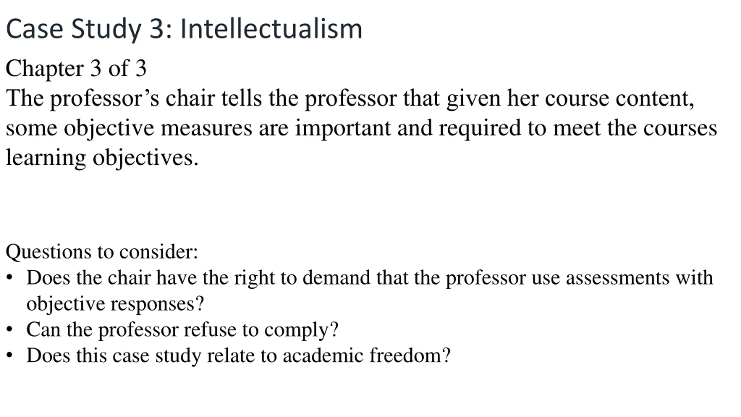 Case Study 3: Intellectualism Chapter 3 of 3 The professor s chair tells the professor that given her course content, some objective measures are important and required to meet the courses learning objectives. Questions to consider: Does the chair have the right to demand that the professor use assessments with objective responses? Can the professor refuse to comply? Does this case study relate to academic freedom?