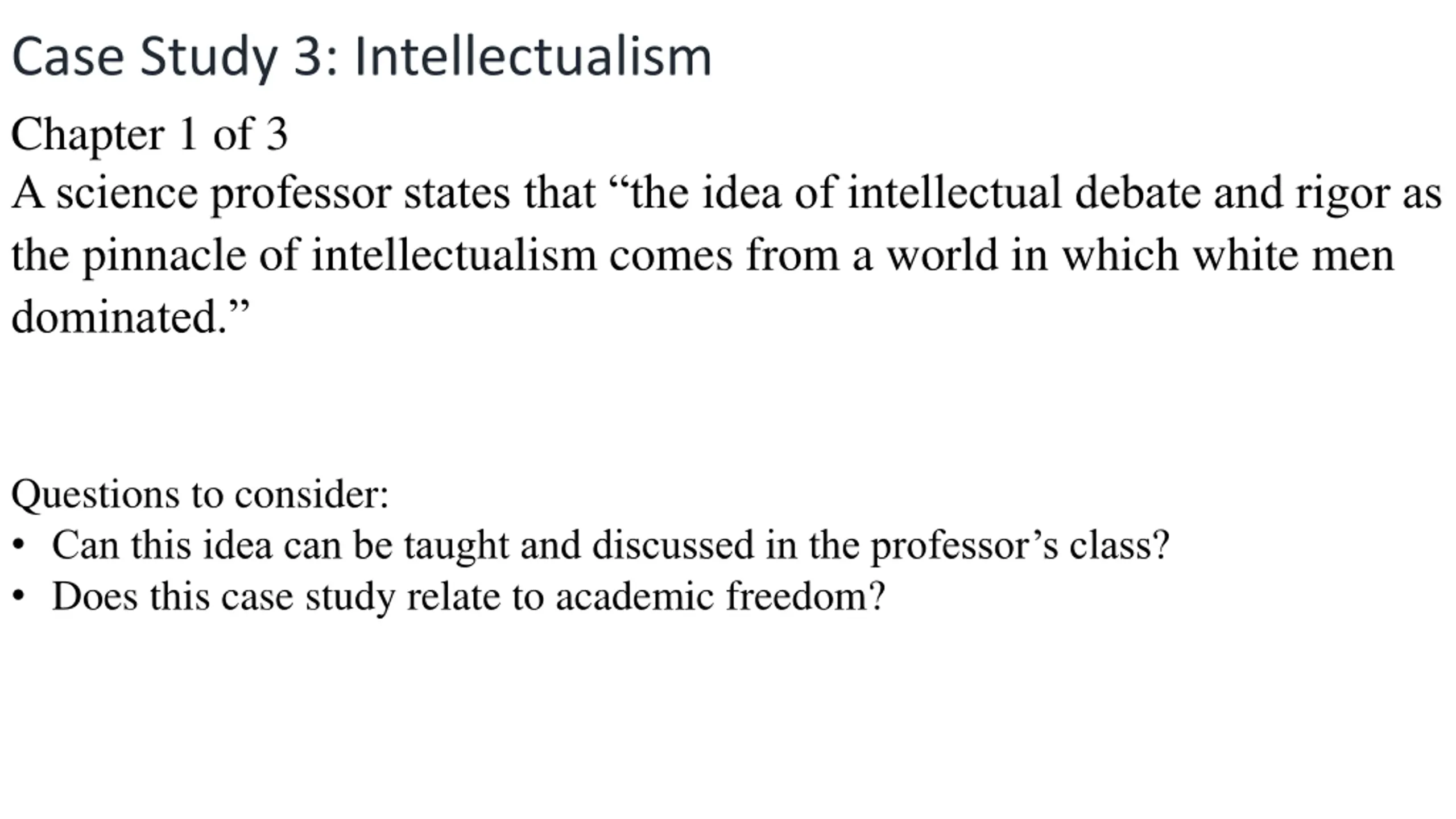 Case Study 3: Intellectualism Chapter 1 of 3 A science professor states that the idea of intellectual debate and rigor as the pinnacle of intellectualism comes from a world in which white men dominated. Questions to consider: Can this idea can be taught and discussed in the professor s class? Does this case study relate to academic freedom?