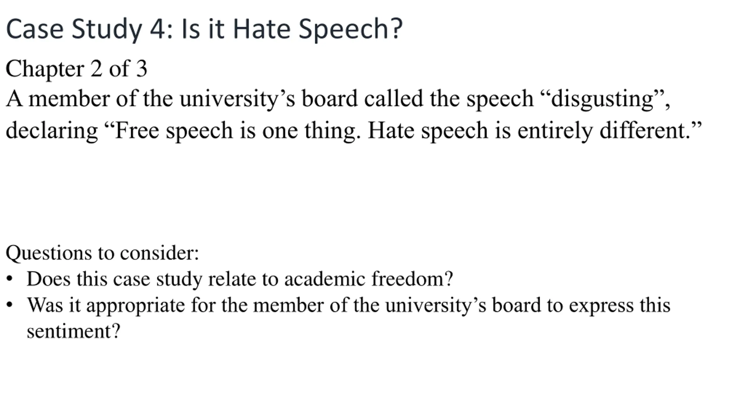 Case Study 4: Is it Hate Speech? Chapter 2 of 3 A member of the university s board called the speech disgusting , declaring Free speech is one thing. Hate speech is entirely different. Questions to consider: Does this case study relate to academic freedom? Was it appropriate for the member of the university s board to express this sentiment?